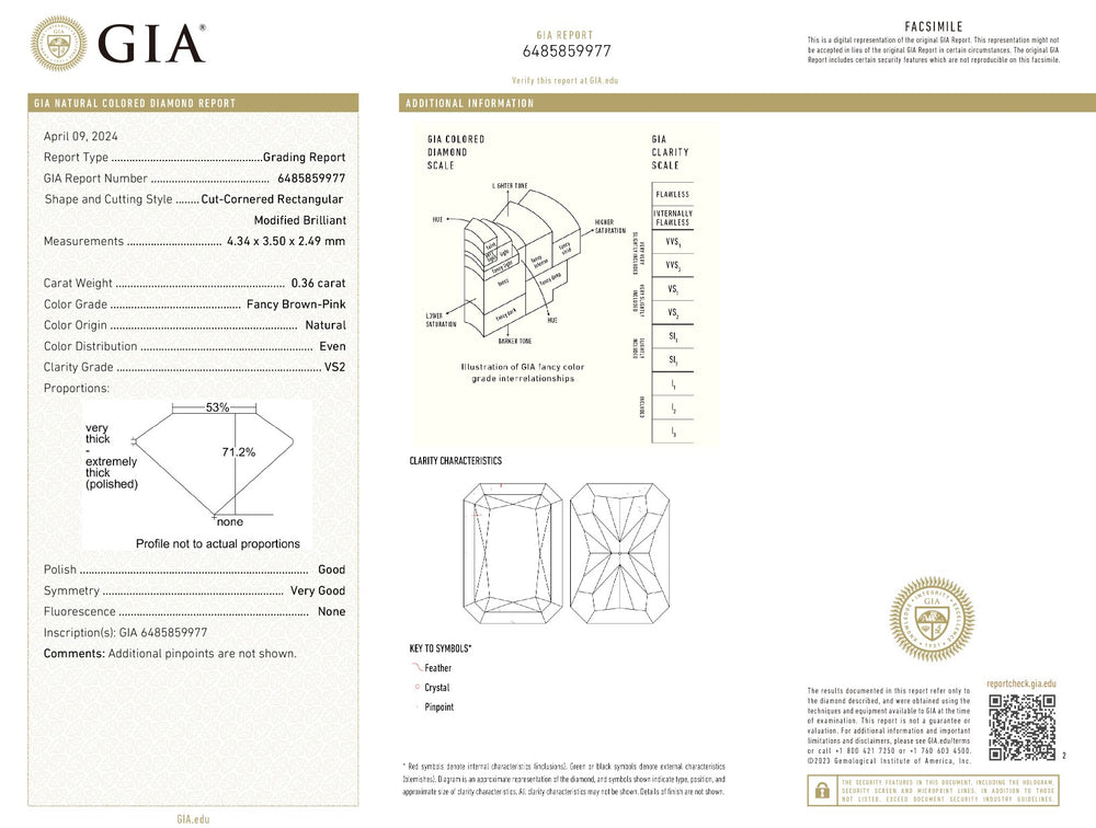 Shut your eyes and imagine the desert sunset captured in gemstone. When you hold this 0.36-carat fancy brown-pink diamond, that is precisely the aura it gives. This GIA-certified natural diamond measures 4.34 x 3.50 x 2.49 mm in dimensions. It presents a unique presence through its cut-cornered rectangular brilliant cut. The even color distribution showcases a warm, consistent blush throughout the stone, evoking images of clouds of dusk.