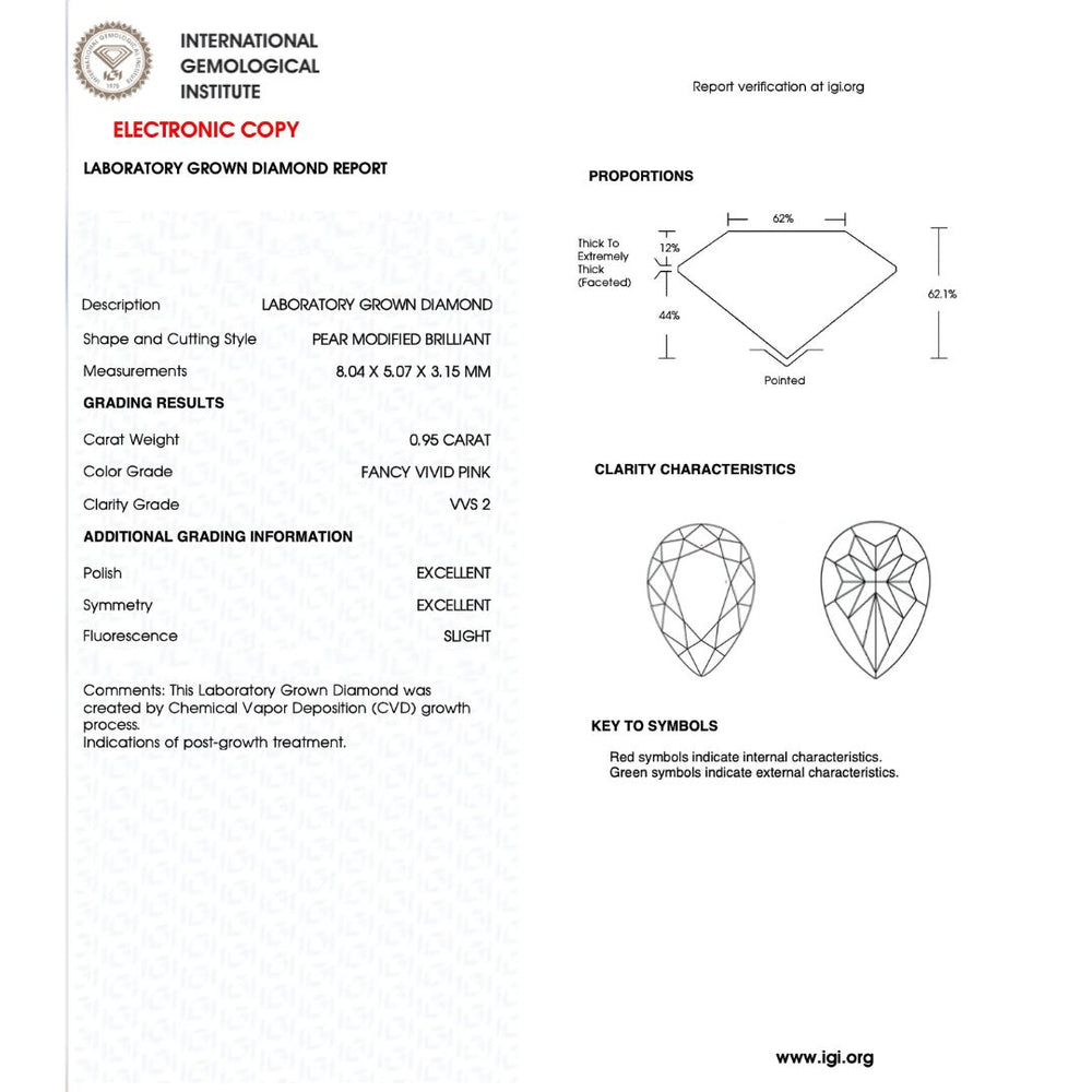 0.95 carat Vivid Pink Pear Cut VS2 Lab Grown Diamond | IGI Certified