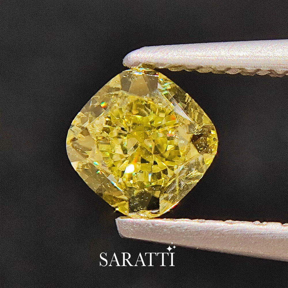 Cut in a cushion-shaped modified brilliant style, the diamond balances soft contours with structured brilliance. The faceting supports brightness while maintaining color concentration, ensuring the intense yellow hue remains the focal point rather than being washed out by excess sparkle.