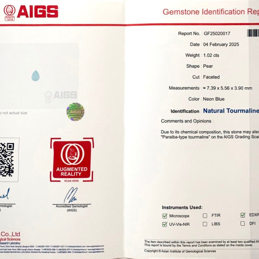 1.02cts Teardrop Natural Paraiba Tourmaline | AIGS Certified | Neon Blue