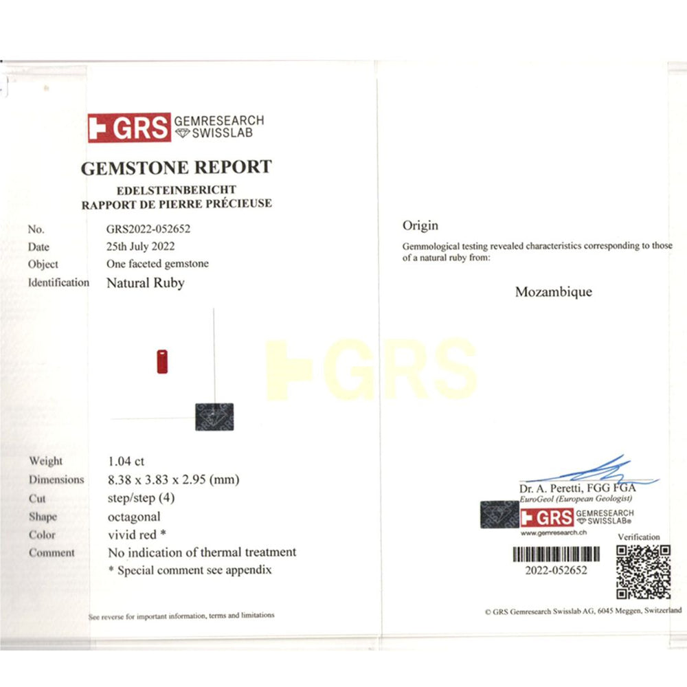 This ruby gemstone is a treasure of nature's finest craftsmanship. A 1.04- carat oval stone which is certified by the prestigious Gemological Research Swiss Lab (GRS). This gemstone hails from the rich mines of Mozambique, known for producing rubies of incredibly brilliance and quality.