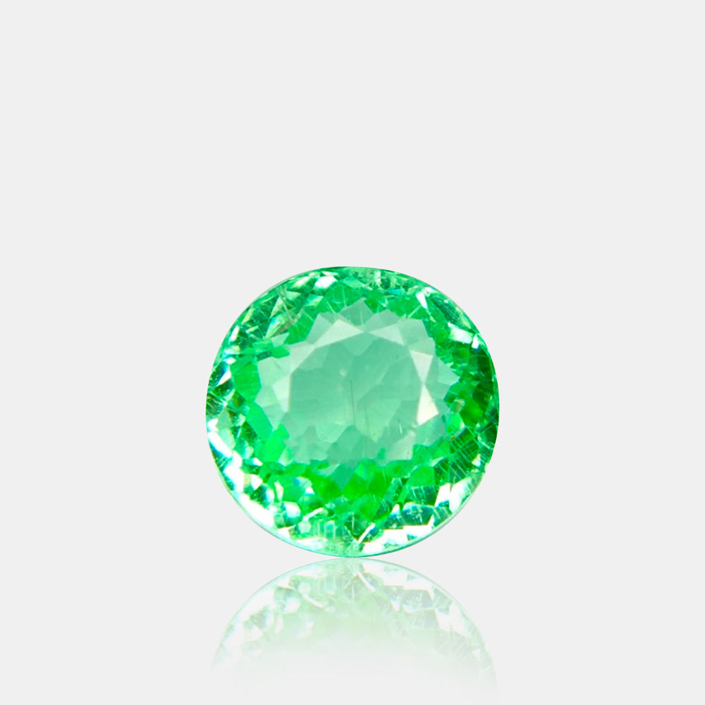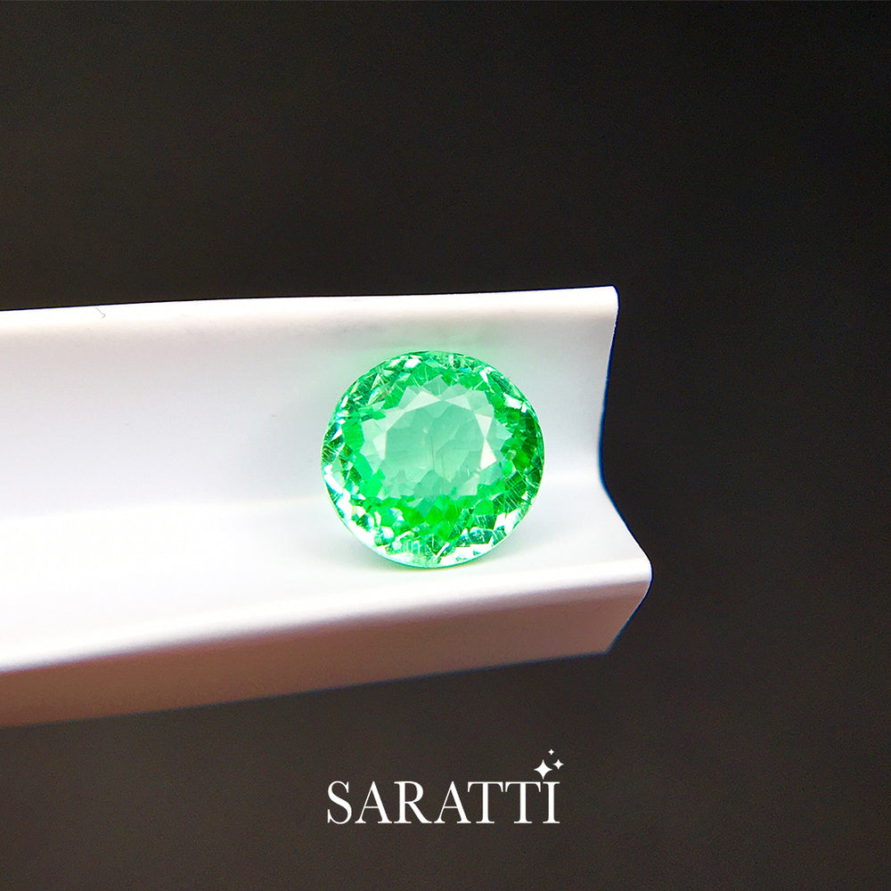 Cut in a near round faceted shape, the stone displays lively brilliance with balanced light return across the surface. The faceting enhances its vibrant hue, allowing flashes of bright green to shift subtly as the stone moves. The clarity appearance is eye-clean, presenting a clean and bright face-up look.