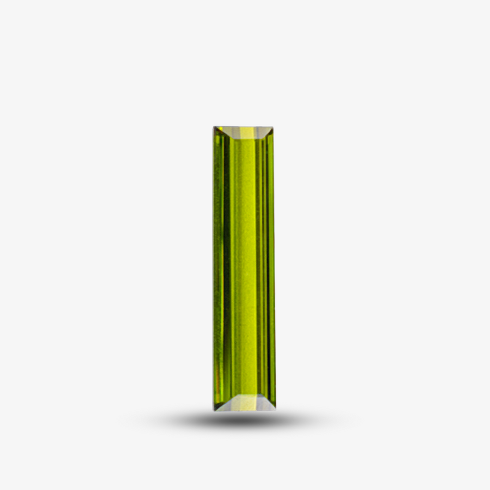 This sleek Green Tourmaline showcases an elongated emerald cut that maximizes its distinctive proportions of 16 x 3.5mm. The stone's elegant 1.5-carat weight has been masterfully fashioned into a refined baguette shape, perfect for modern jewelry designs. The exceptional VVS clarity allows the rich olive-green color to shine through unimpeded, while the step-cut faceting pattern creates a sophisticated play of light.