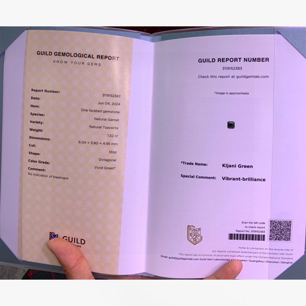 The octagonal step cut gives the gemstone a refined, architectural character, emphasizing clean lines and depth of color over surface sparkle. Recognized by GUILD with the Vibrant-Brilliance designation, the stone demonstrates exceptional light performance, achieved through precise cutting and strong transparency. Light moves deliberately through the step facets, creating a calm yet confident visual rhythm.