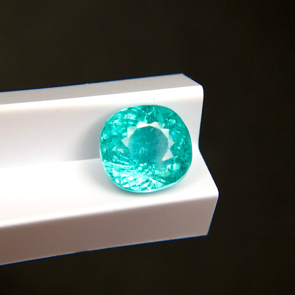 The cushion shape gives this gem a perfect balance between modern flair and classic elegance - not too round, not too square, just right for someone who appreciates something special. This natural Paraiba-type tourmaline from Brazil is a rare find indeed! Its captivating color saturation makes its stand out in any setting, whether you are planning to showcase it in a ring that will have anyone talking or a statement pendant.