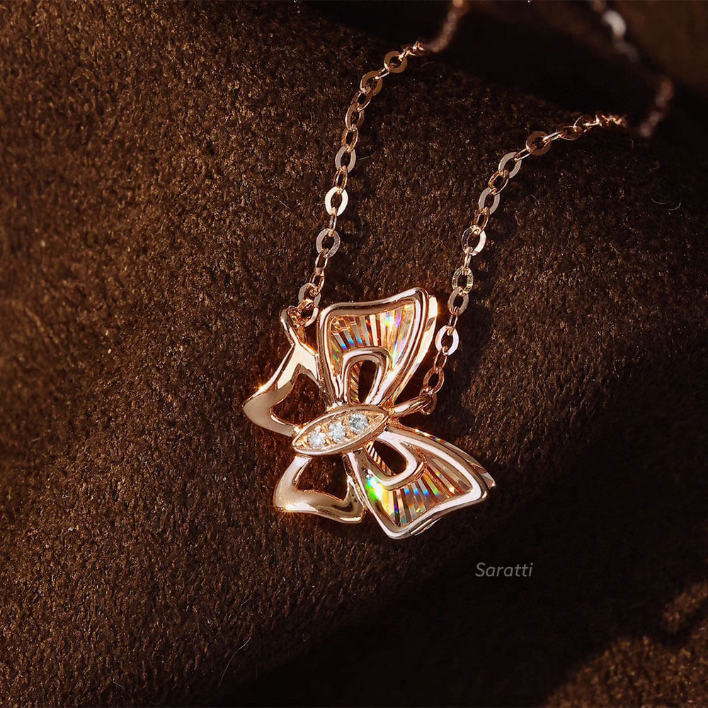 These stones are expertly set to mimic the effect of butterflies in sunlight, catching light from every angle. The wings of the butterfly are designed with a mix of open cutout areas and solid gold edges. The upper wings have a curved design while the lower wings have a more geometric shape adding a contemporary twist to the traditional butterfly motif. The butterfly then appears to float, dangling from an 18K yellow gold chain. This creates a playful and elegant look.