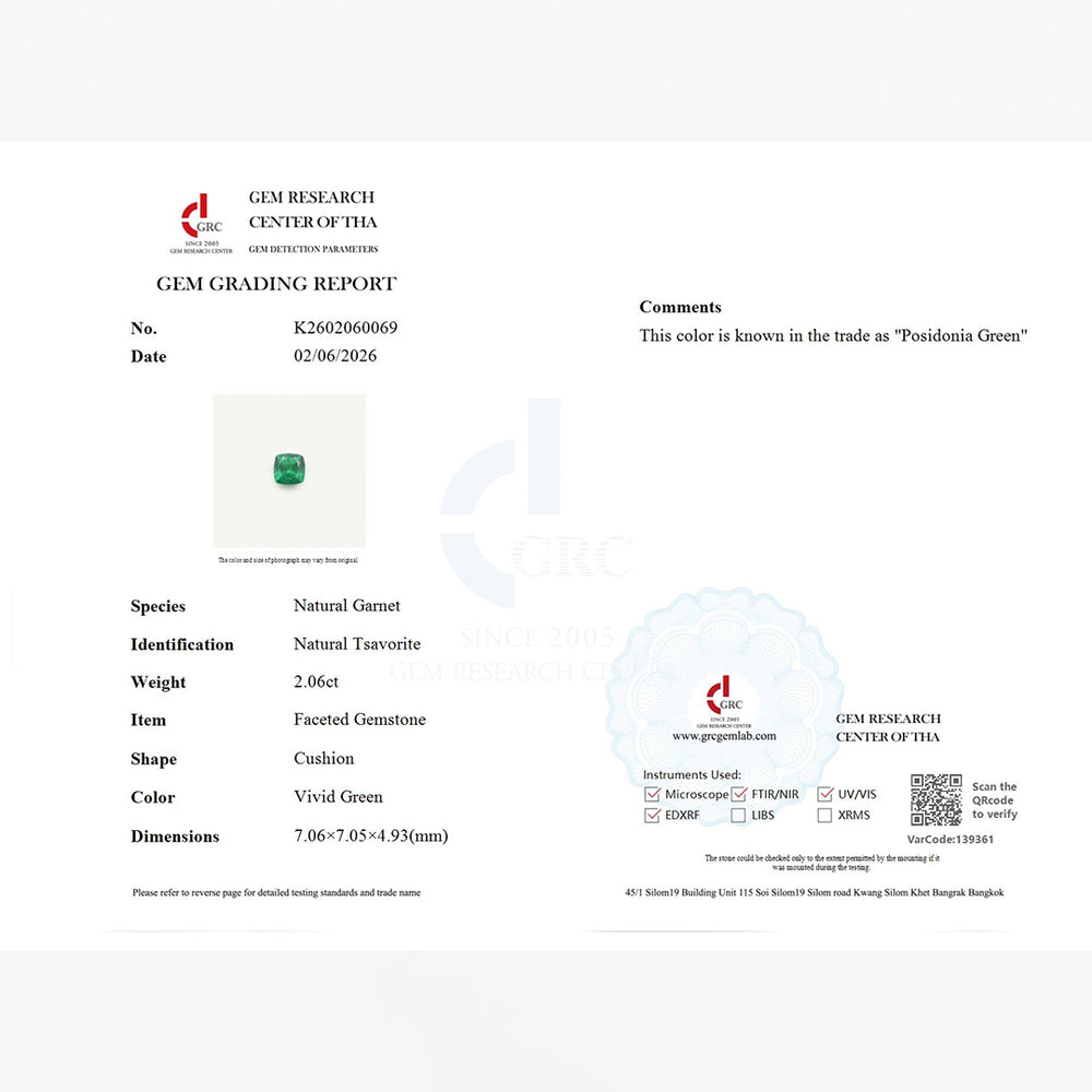 2.06 carats Natural Posidonia Green Tsavorite | Cushion – 7.06 × 7.05 × 4.93mm