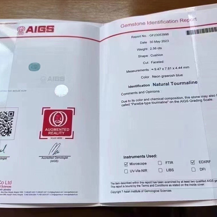 Experience the true brilliance of this AIGS-certified Natural Paraiba tourmaline, a rare treasure that captures the aura and essence of tropical waters with its captivating neon-greenish blue colour. This distinctive gemstone weighs 2.56 carats and features a premium cushion cut with expert faceting that increases its vibrant light reflection and colour. Measuring approximately 9.47 x 7.81 x 4.44 mm, this tourmaline offers a great presence while maintaining perfect proportions for versatile jewelry settings.
