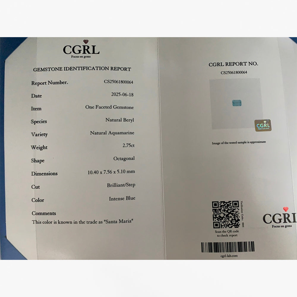 Graded by CGRL as Santa Maria in color, this gemstone displays the most coveted expression of aquamarine’s spectrum: a rich, intense blue inspired by the legendary stones once discovered in Brazil’s Santa Maria de Itabira mines. It is a color associated not with lightness, but with clarity, confidence, and quiet strength.