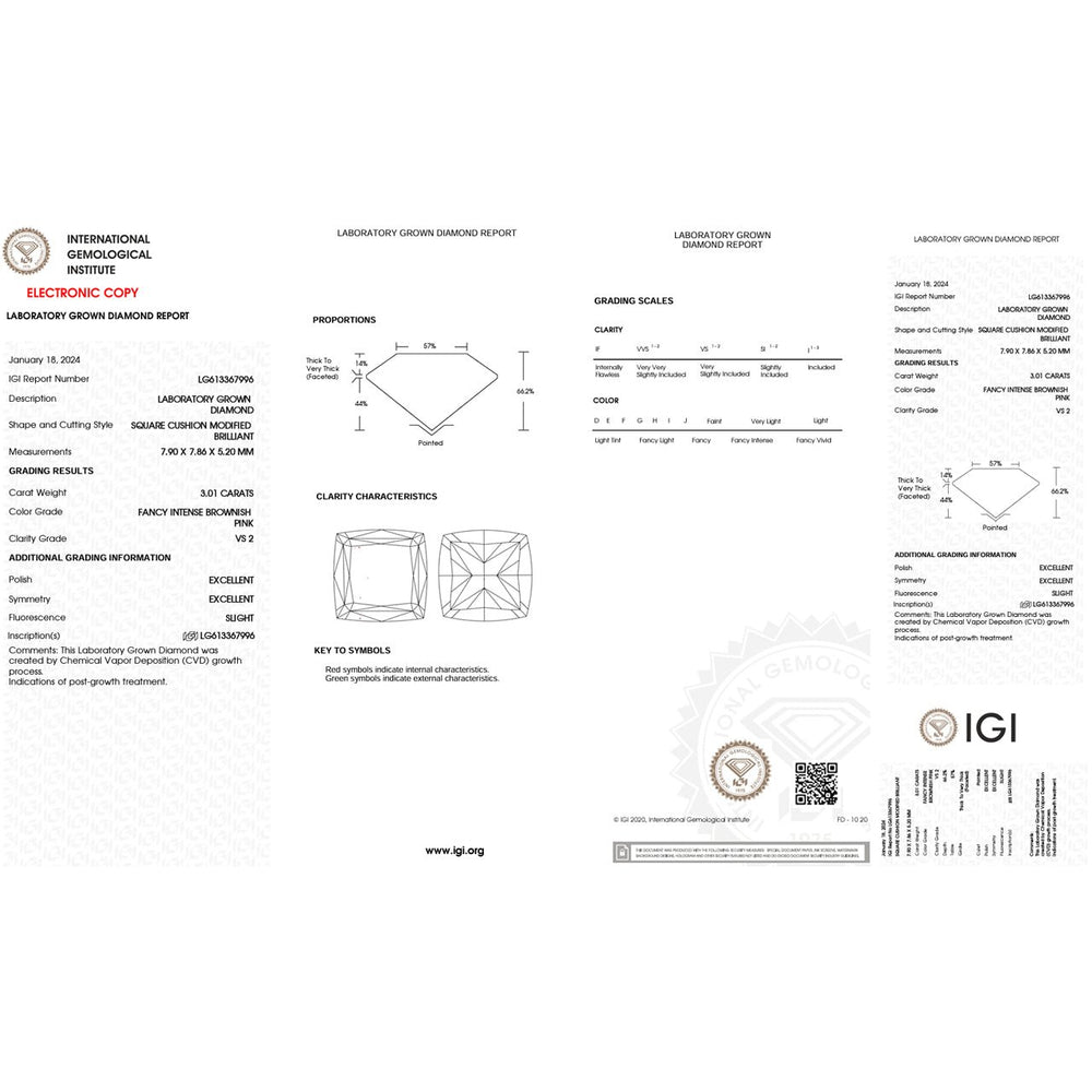 3.01 cts Cushion Cut VS2 Fancy Intense Brownish Pink Lab Diamond | IGI is backordered and will ship as soon as it is back in stock.