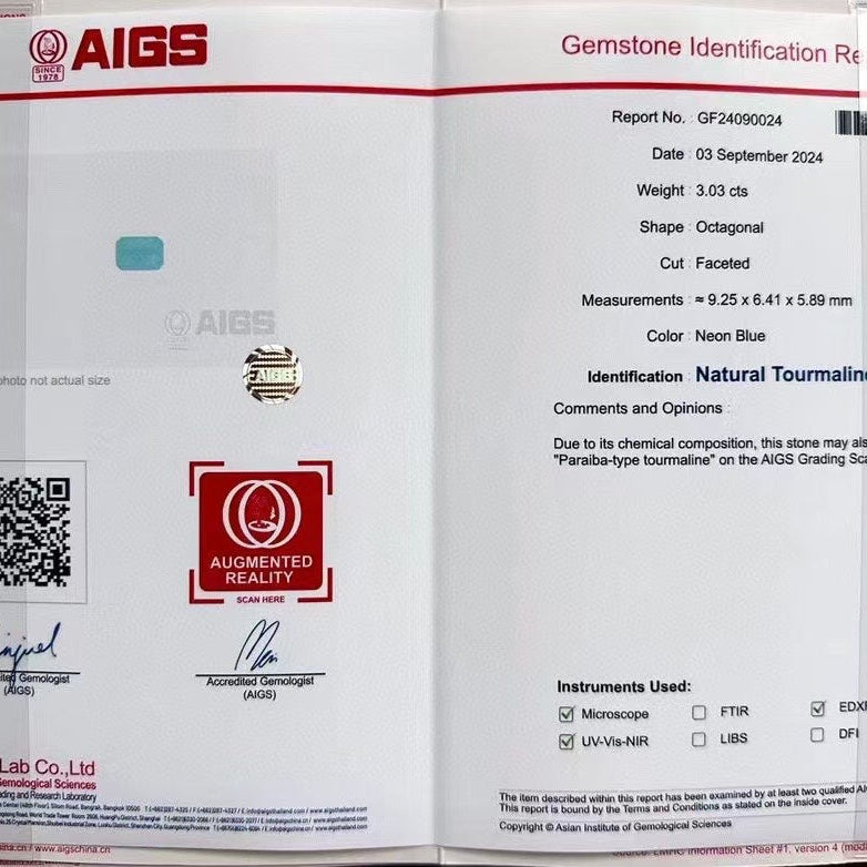 3.03 carat Neon Blue Octagonal Paraiba Tourmaline | AIGS Certified is backordered and will ship as soon as it is back in stock.