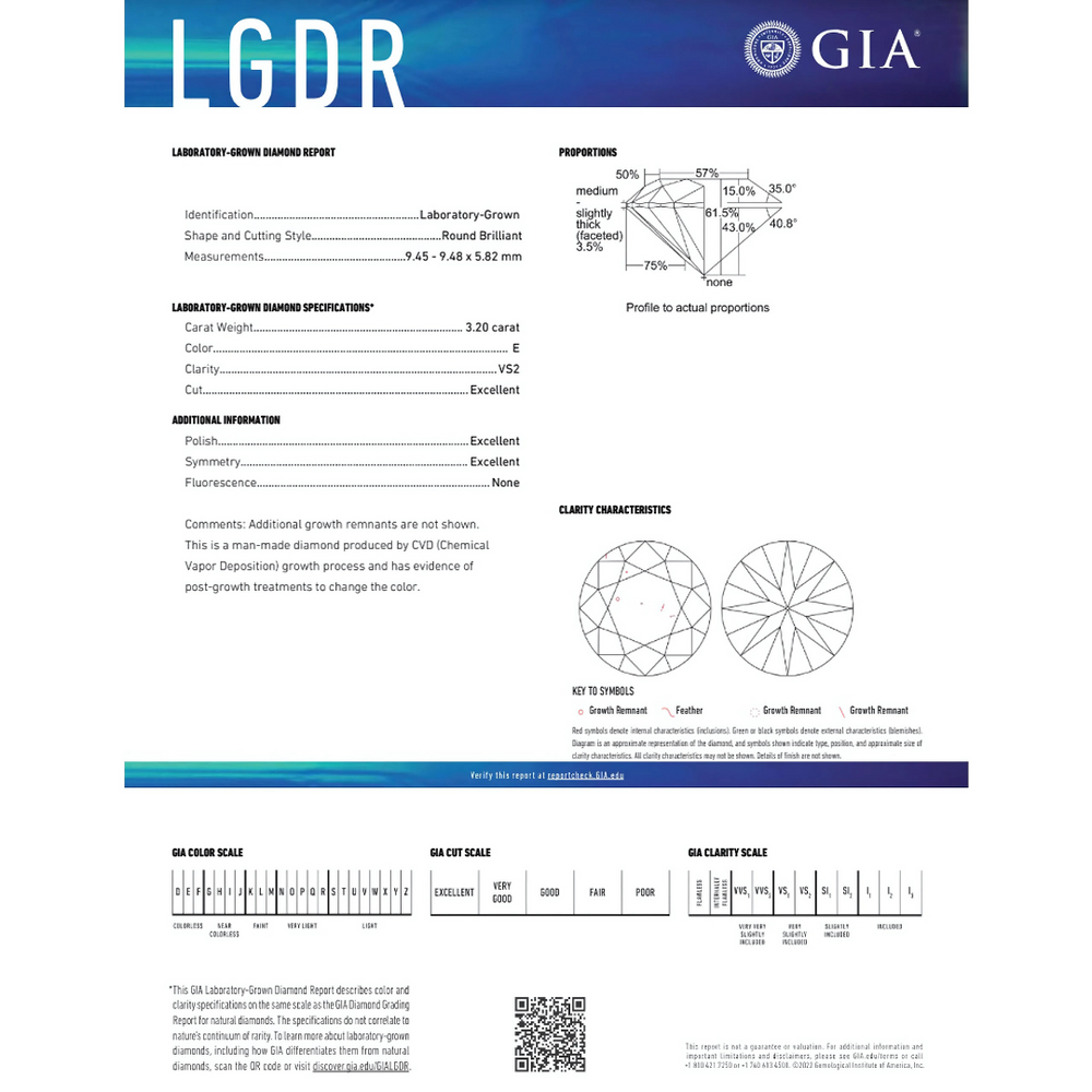 The E color grade places this diamond within the "colorless" range while the VS2 clarity indicates that any inclusions are minute and invisible to the naked eye. The GIA certification, provides total assurance of the diamond's lab grown origin, quality and specifications.