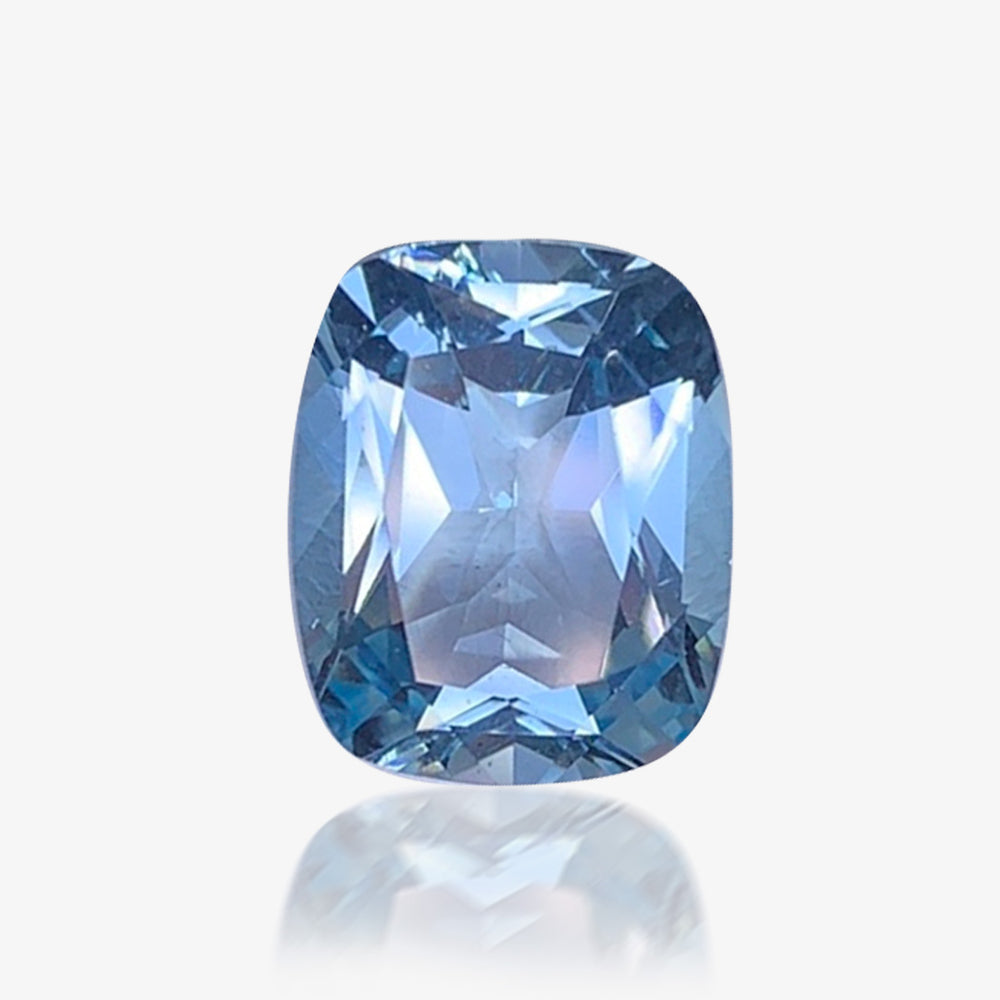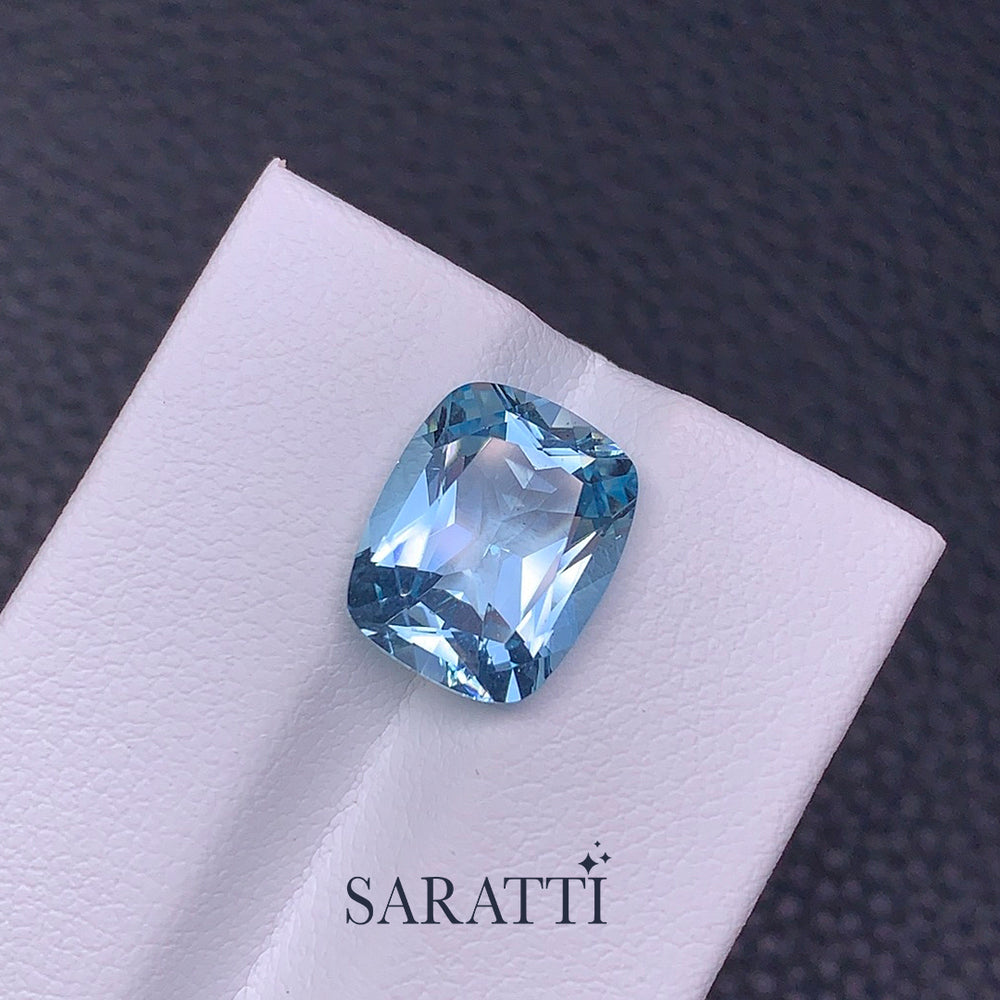 This Natural Santa Maria Aquamarine displays a refined ocean-blue tone inspired by the deep, clear waters that made the Santa Maria color legendary. Its cushion cut softens the geometry while preserving brilliance, allowing light to move effortlessly across the stone. With excellent transparency and lively fire, this gem feels calm, elegant, and timeless—an exceptional choice for a refined custom creation.