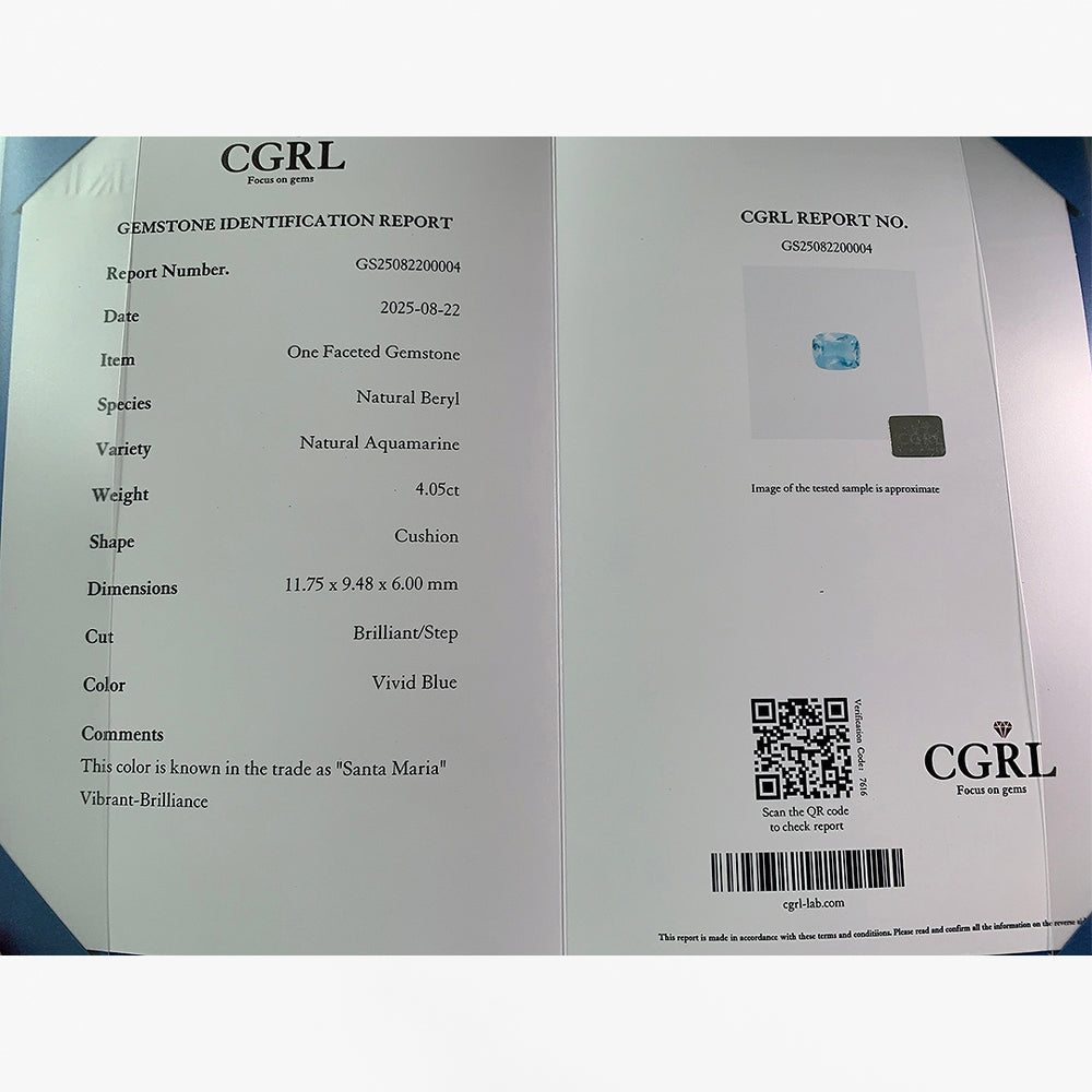 4.05ct Natural Santa Maria Aquamarine | Cushion – 11.75 × 9.48 × 6.00mm | CGRL Certified