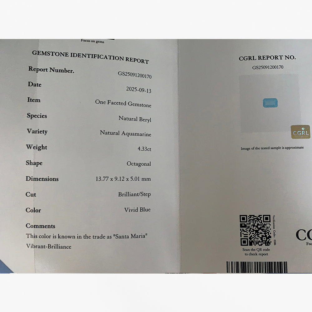 4.33ct Natural Santa Maria Aquamarine | Octagonal – 13.77 × 9.12 × 5.01mm | CGRL Certified