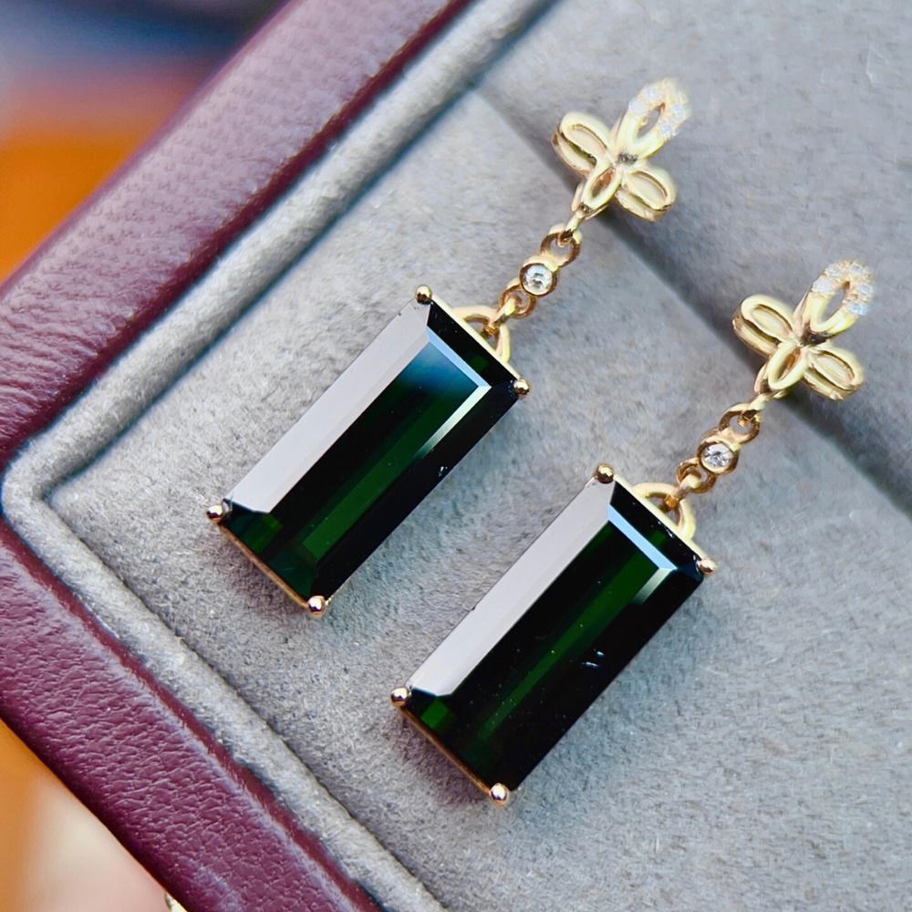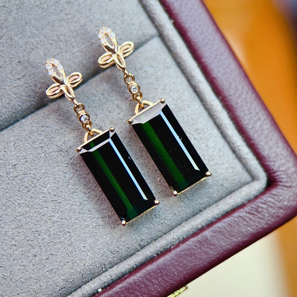 The Emerald Gates earrings stand as architectural icons in jewelry form. Featuring 4.7ct of natural emerald-cut green tourmalines, their elongated silhouettes radiate depth and luminosity, recalling cathedral windows lit with color. Each stone is suspended from a floral-inspired crest of 18K yellow gold, with twelve sparkling diamonds illuminating the design like light scattering through glass. Bold yet refined, they blend strength and delicacy, making them both a statement piece and a timeless heirloom. Whether as a gift of love or a treasure of self-expression, these earrings embody elegance reimagined. Own yours today.