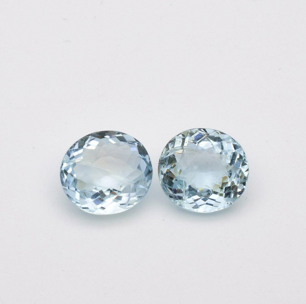 Behold an ethereal duo: twin aquamarines! This matched pair of aquamarines is clean ocean water in crystal form. These twins weigh a collective 5.96 carats, have an enchanting light blue tone that invites you into a world of luxury and elegance. Expertly cut into perfect ovals, each stone has impressive 10.21 mm x 9.39 mm dimensions offering you a weighty presence that isn’t too bold for many.