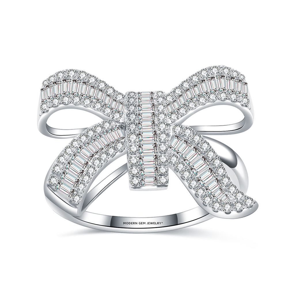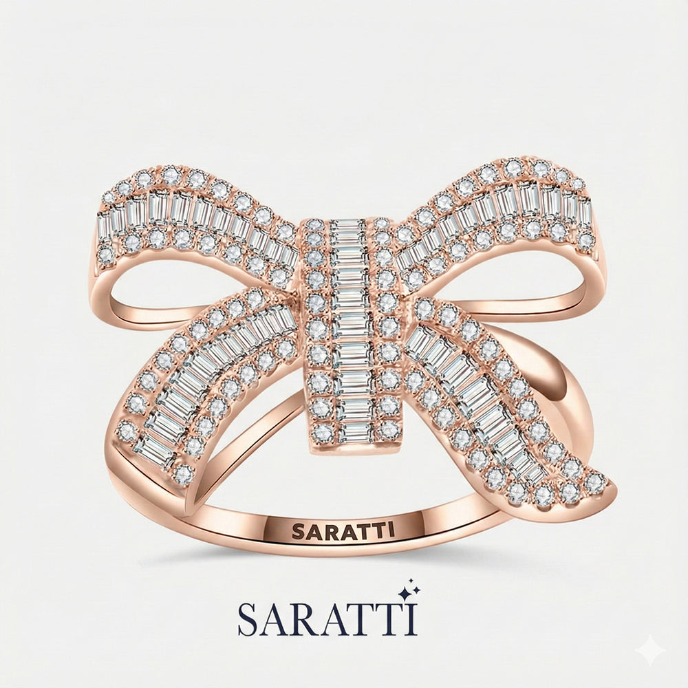 A stunning ribbon design, set in gleaming white gold is the perfect summation of this ring. Its centerpiece is a graceful bow, adorned with a dazzling array of baguette-cut or round diamonds, totaling approximately 1 carat in weight. The combination of these two cuts of diamonds creates an interplay of architectural precision and brilliance. The ribbon motif is masterfully executed with the loops of bow and tails sweeping across the finger in graceful curves. Baguette diamonds from the central lines of the ribbon, their shape highlighting the flow of the design.