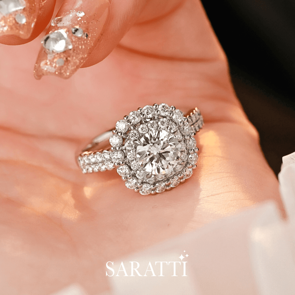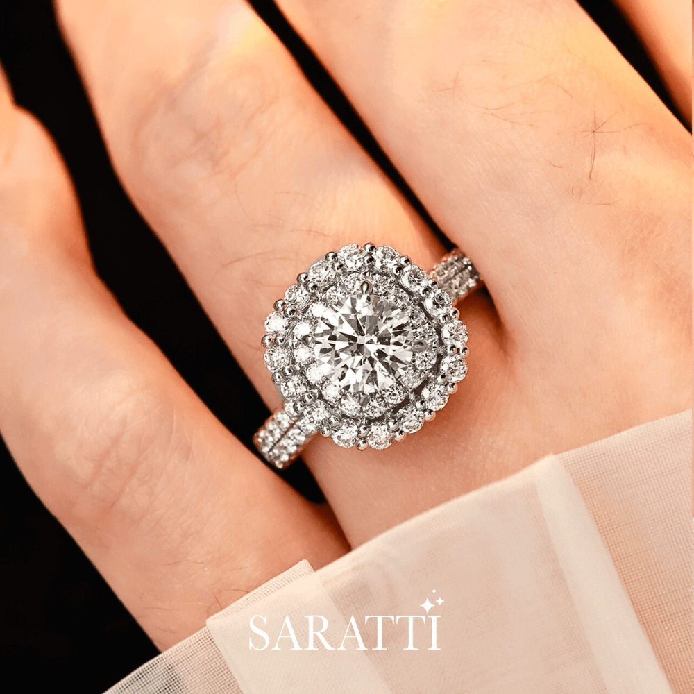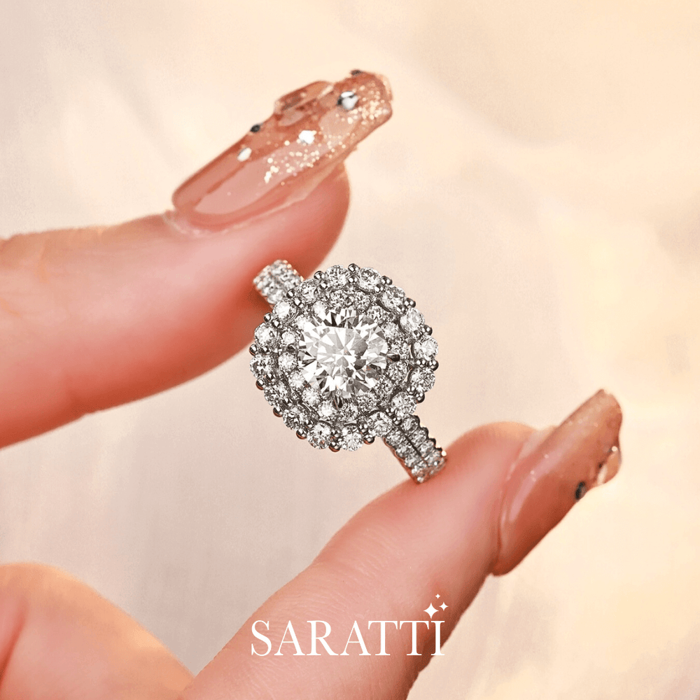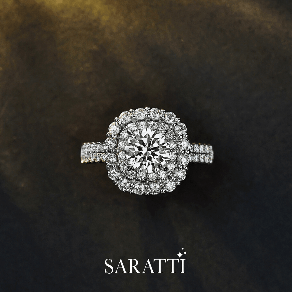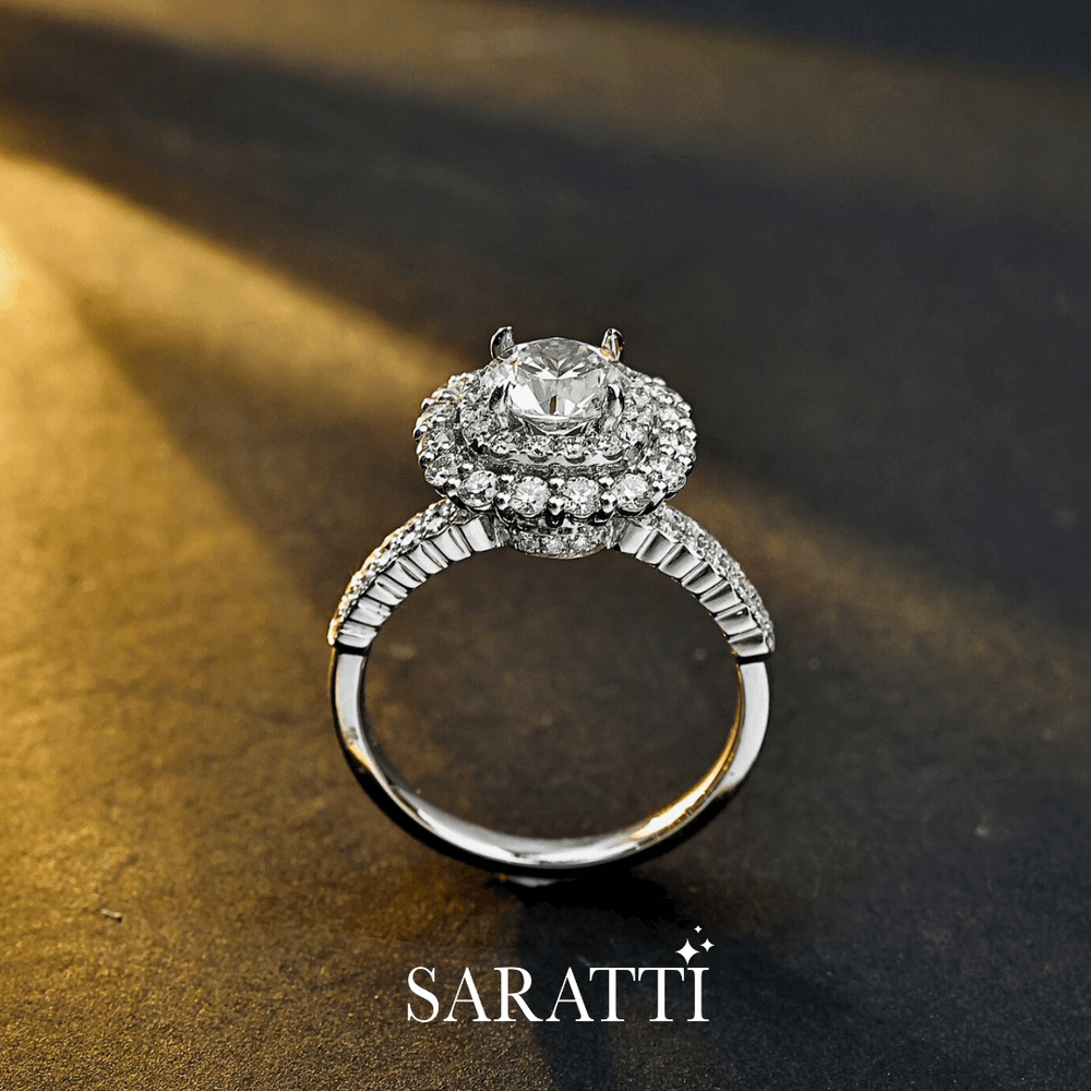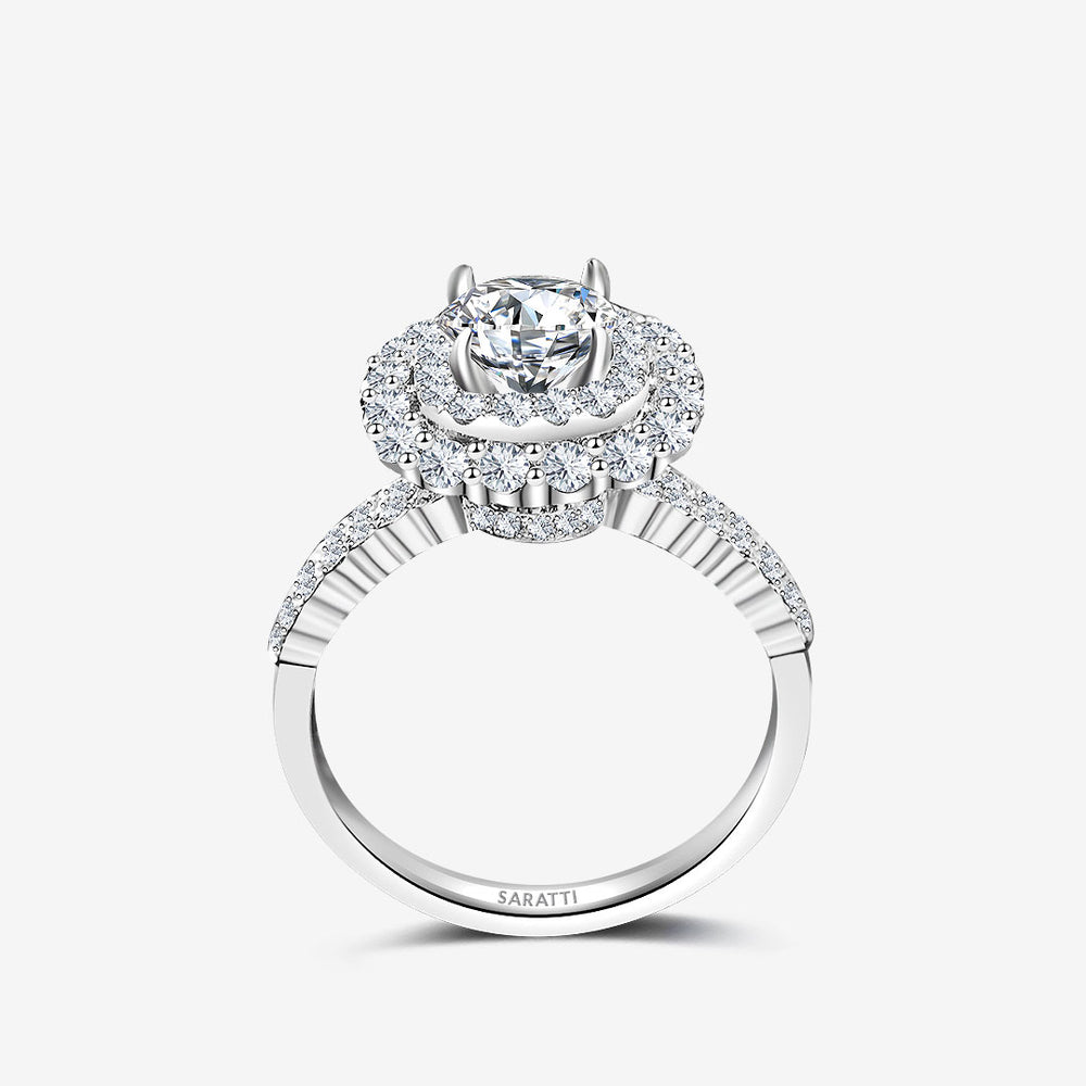 A refined expression of layered brilliance, this ring features a round center stone elevated above a triple halo in polished 18K white gold. Its sculpted split shank and pavé-set detailing create a design that feels luminous, dimensional, and timeless.