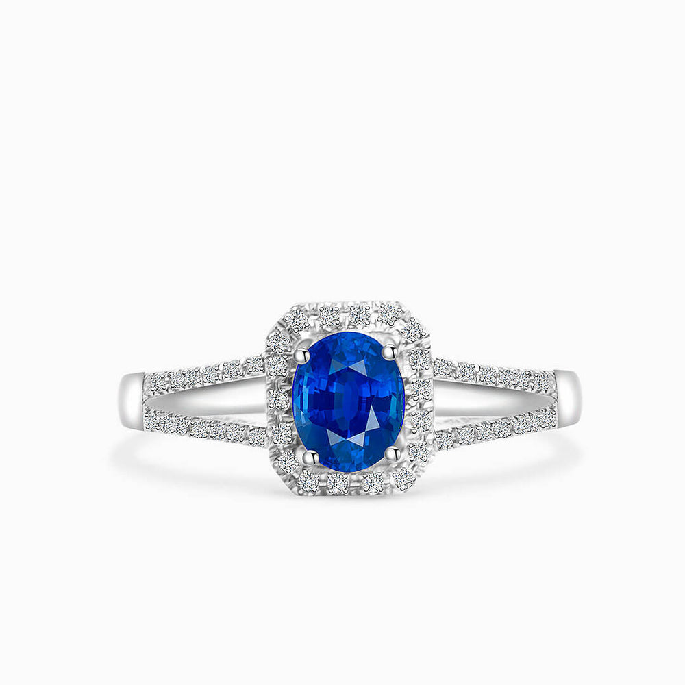 The split shank design adds a modern touch. It features two delicate bands which are diamond-studded. They beautifully embrace the center stone. This provides a nice structural support and a nice play of light. The 18K White Gold perfectly complements the rich blue of the sapphire and the ice of the diamonds.
