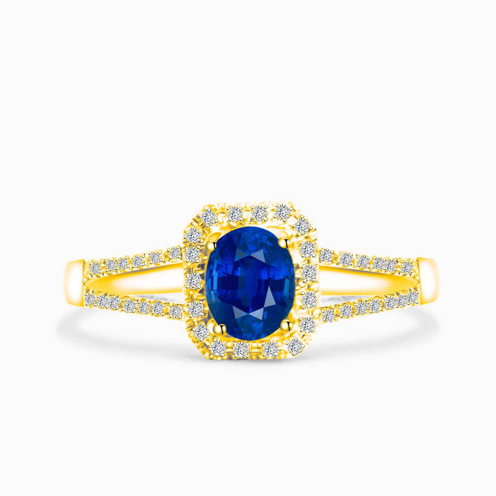 This stunning sapphire and diamond ring is the perfect jewelry indulgence. It showcases an oval-cut blue sapphire much like the deep azure color depths of the night sky. It is embraced by a glittering halo of natural diamonds that upgrade its size and sparkle.