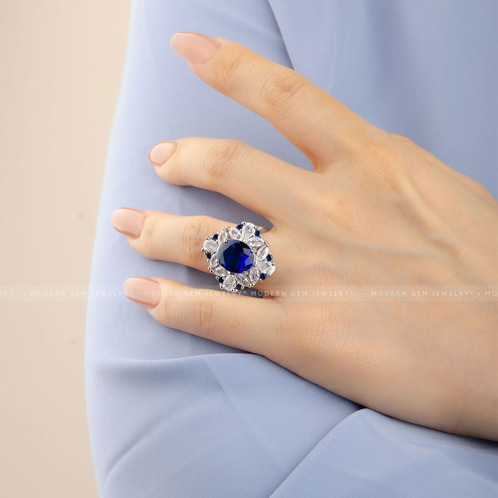 This center stone is surrounded by an intricate arrangement of sapphires and diamonds that create a dazzling halo. These are smaller sapphires, strategically placed to complement and enhance the vivid blue of the center stone. They weigh approximately 0.8 carats.