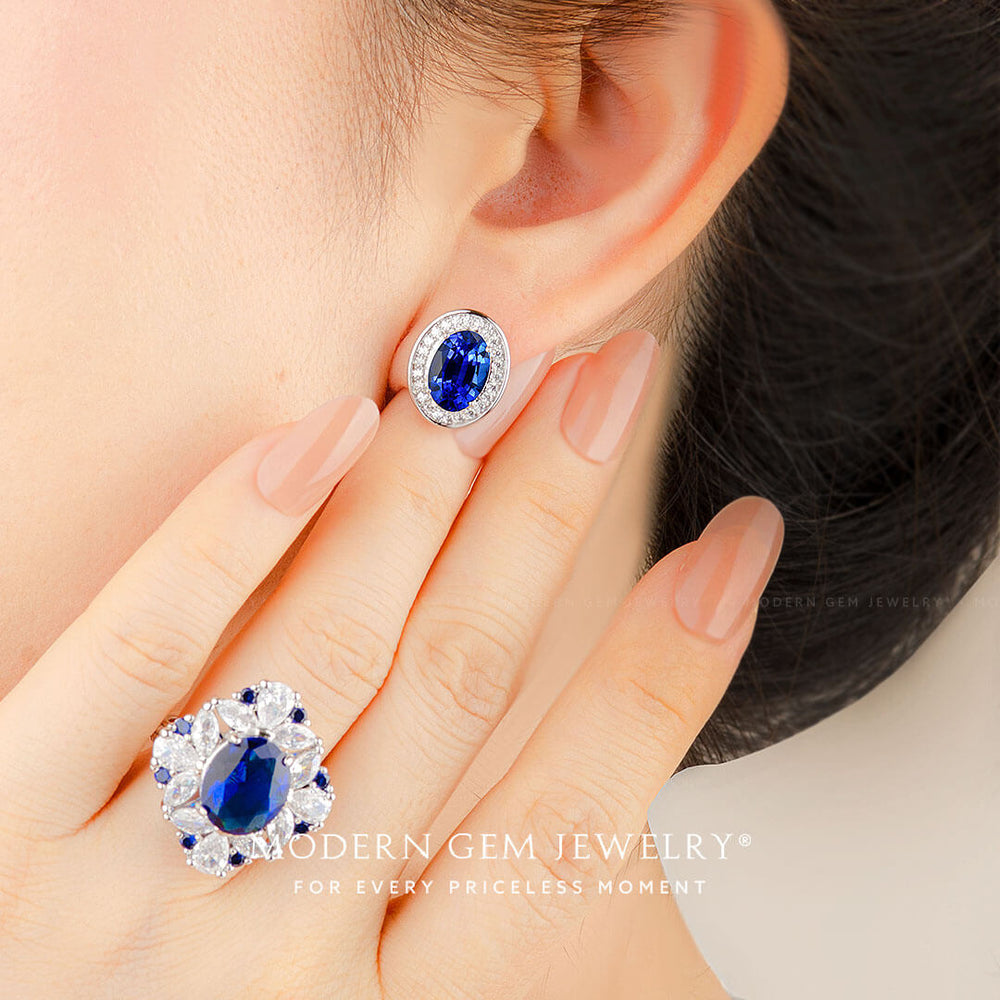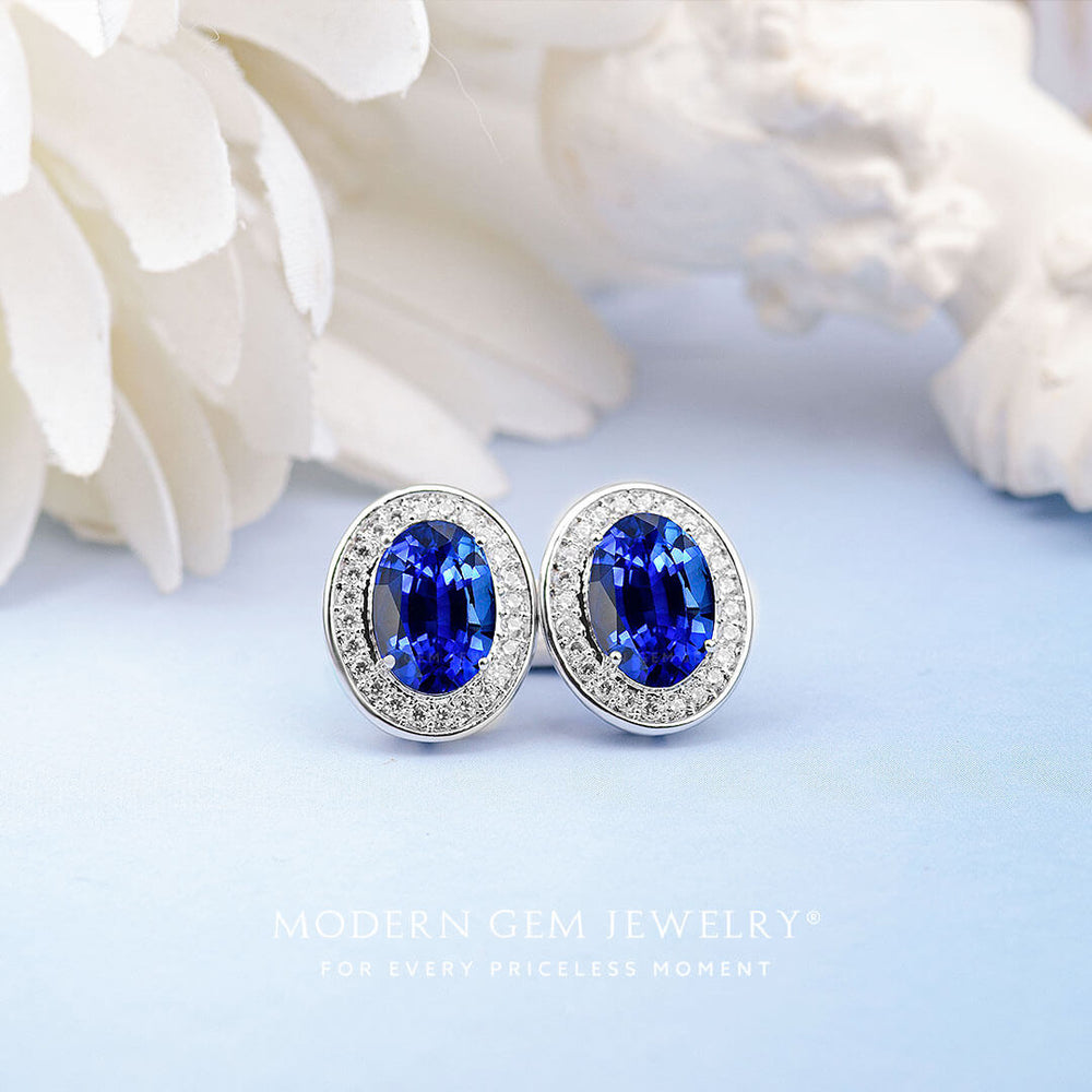 The surrounding diamonds are pave-set, creating a cyclical ring of fire around each sapphire. Every time you move, these earrings send flashes of white and blue across your face. The pairing of the diamonds and sapphires make them ideal for formal and special occasions.