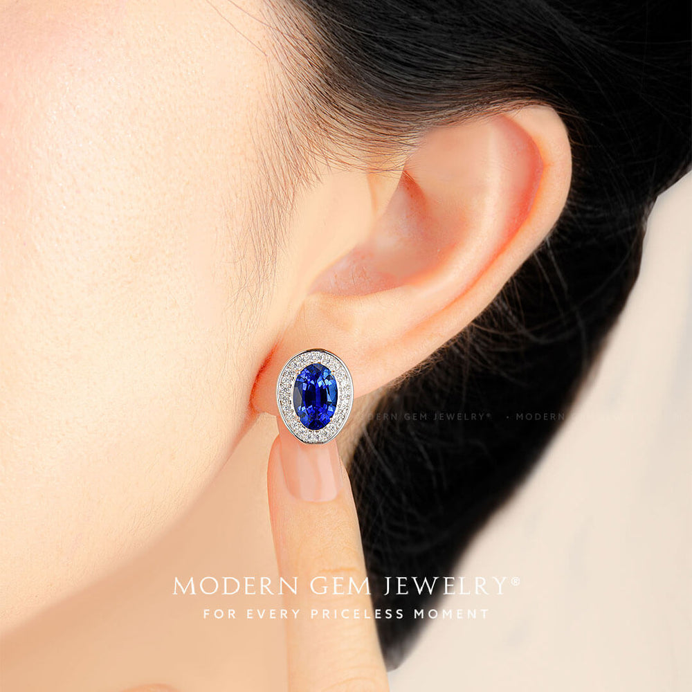 These stud earrings feature oval blue sapphires each weighing 1 carat as their center stones. The deep, blue of the sapphires is gracefully framed by a halo of sparkling diamond. These round cut diamonds weigh a total of 0.20 carats.