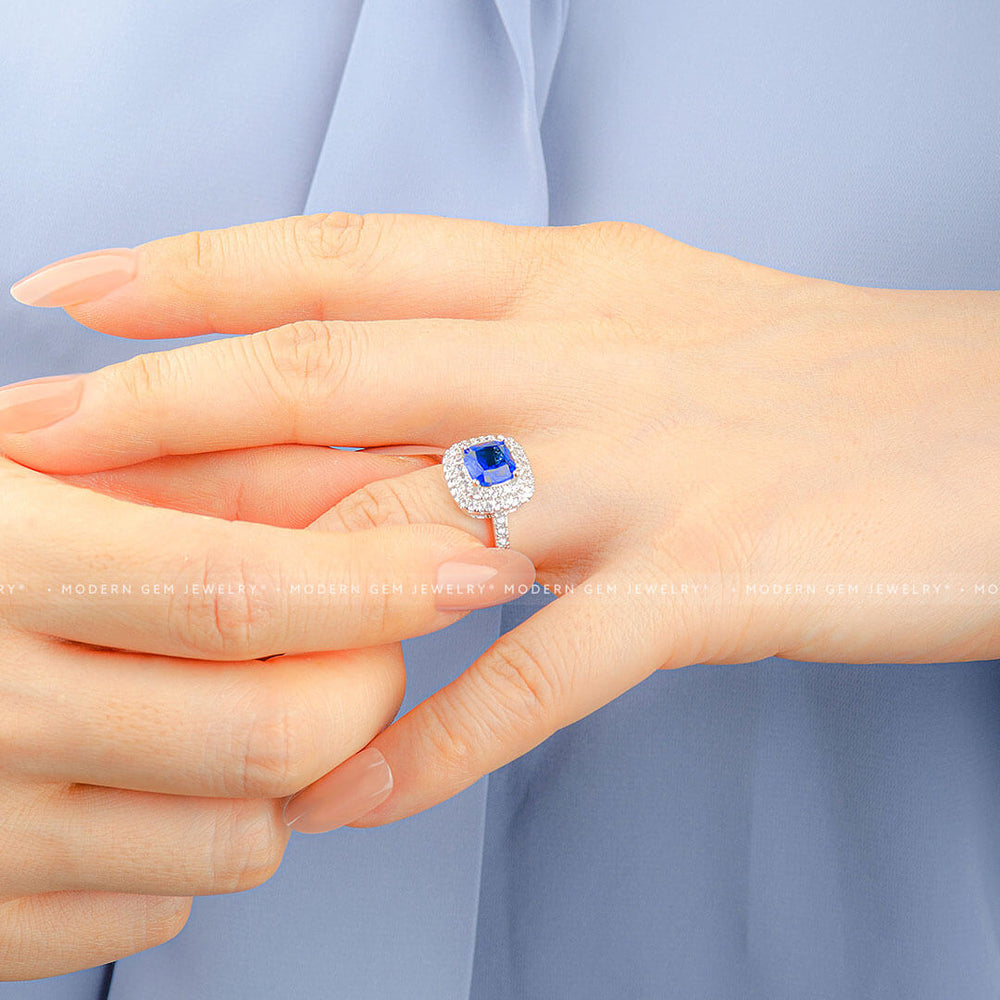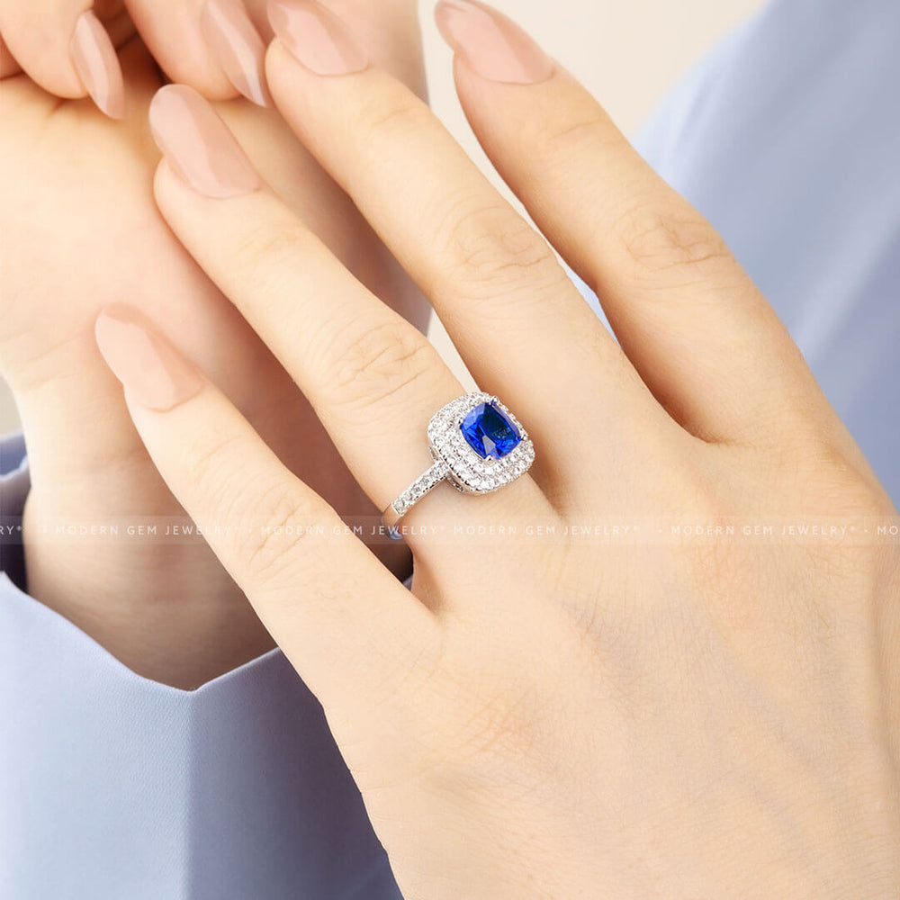 Classic Double Halo Blue Sapphire and Diamond Ring