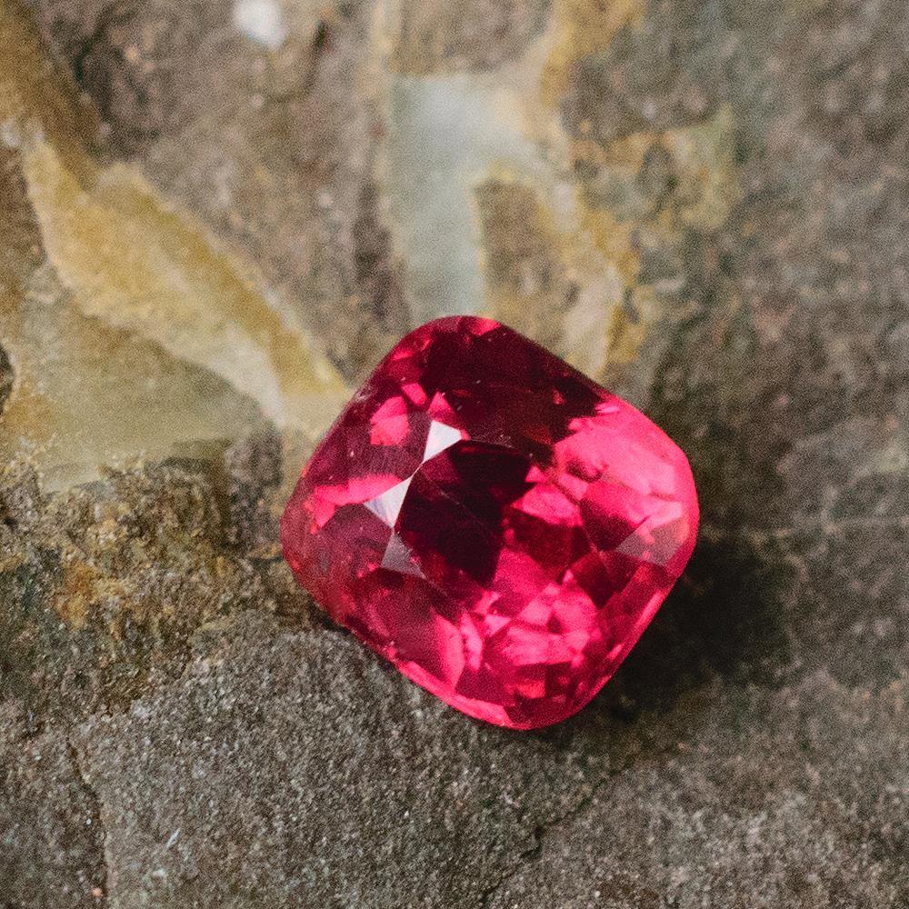 Often mistaken for rubies in old crown jewels, spinel is finally getting its moment in the spotlight. This untreated, natural gemstone shows why. Its fire and brilliance rival that of its more famous counterparts, yet it has its own charm. The cushion cut maximizes its inherent sparkle, creating a lovely display with every motion. Add some spice to your jewelry box.