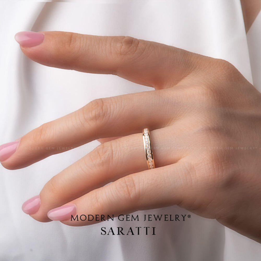The female diamond band features a stunning collection of handpicked colorless diamonds. Delicately handset in 18K Yellow Gold, with all diamonds going fully around the band, representing your eternal commitment.
