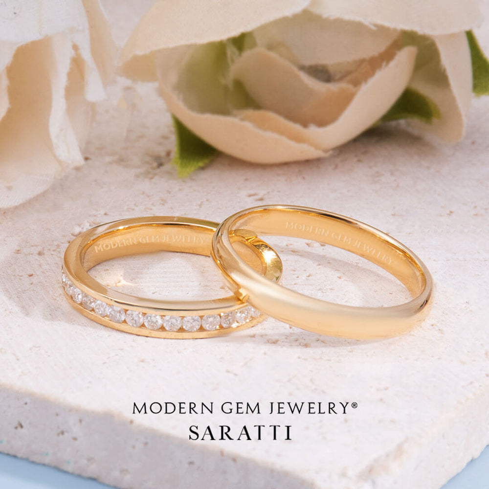 Celebrate true love with our timeless Channel Set Diamond Eternity Wedding Set. This exquisite set features two uniquely handcrafted wedding bands: a channel-set diamond eternity band for her and a classic Yellow Gold comfort fit wedding ring for him.