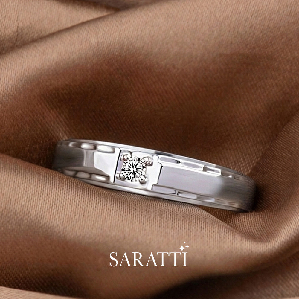 Two fine lines of gold trace the edges of the ring, running along the band like guiding rails. Between them, the polished metal surface reflects light cleanly, allowing the diamond to remain the focal point. The composition feels controlled and deliberate, where every line leads naturally toward the center.