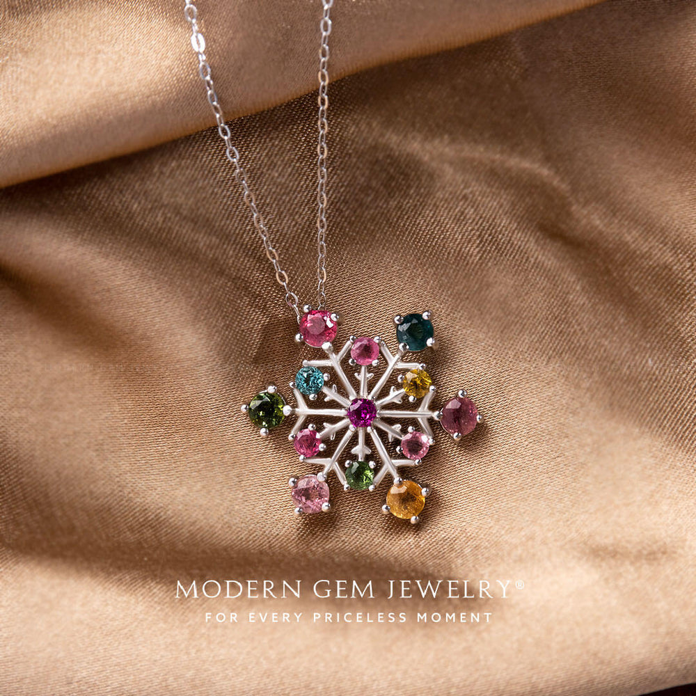 A kaleidoscope of gemstones dances on your neckline, capturing the essence of nature's vibrant palette in a single, stunning piece. The Colorful Tourmaline Snowflake Necklace transforms the fleeting beauty of winter's most delicate crystal into an enduring treasure.