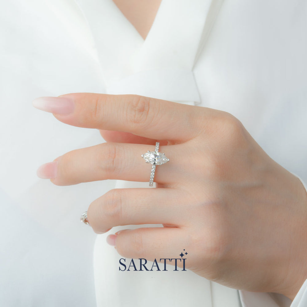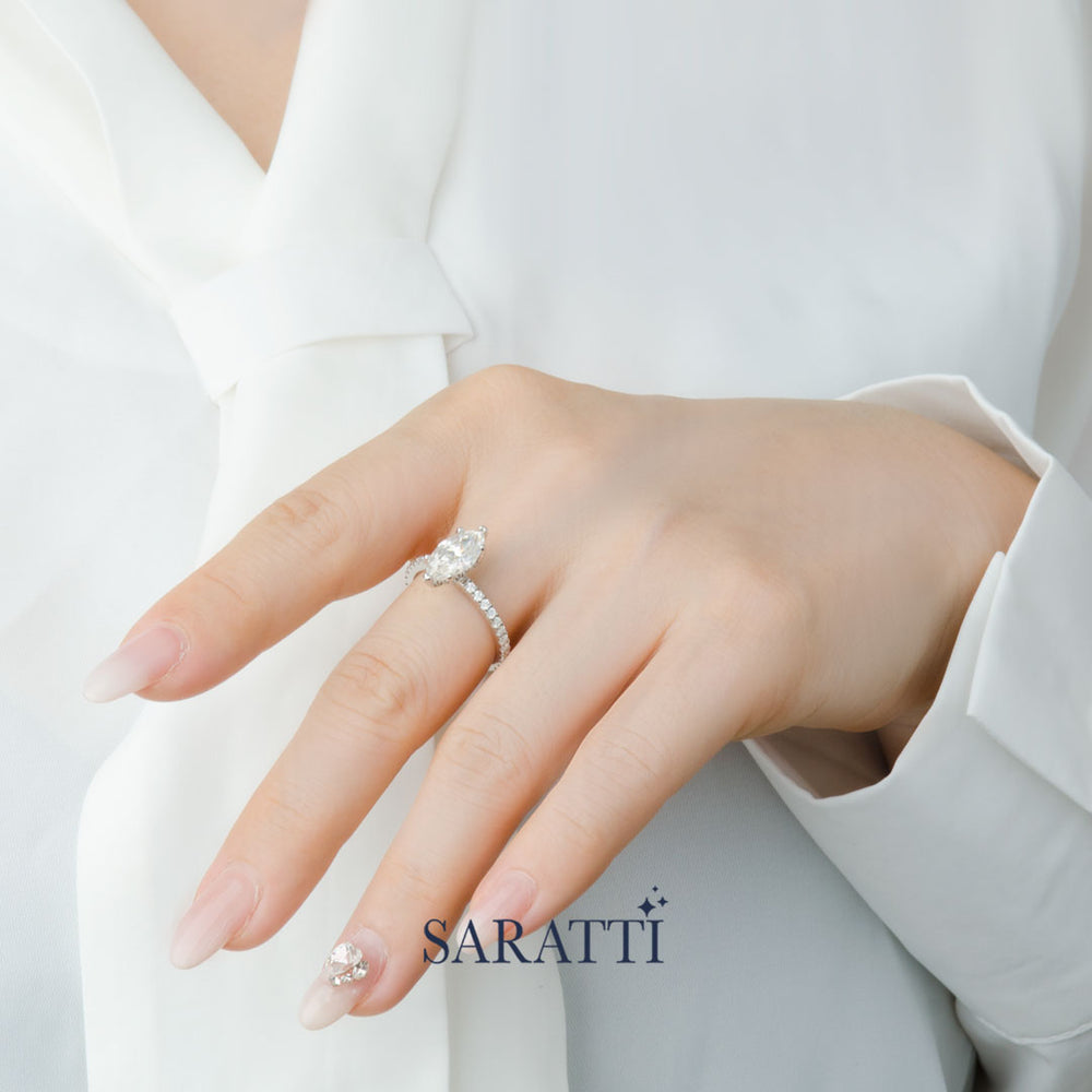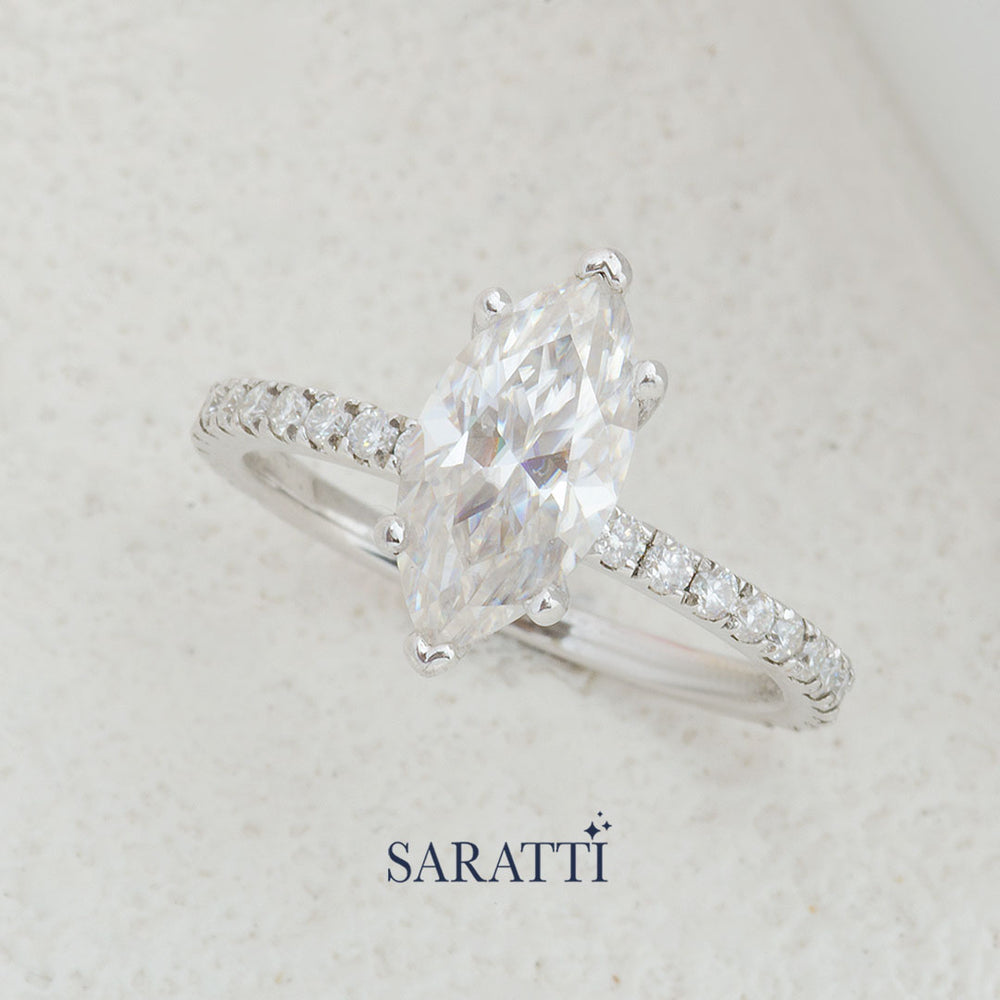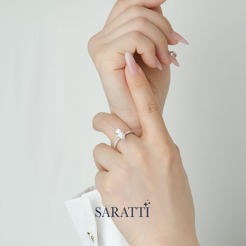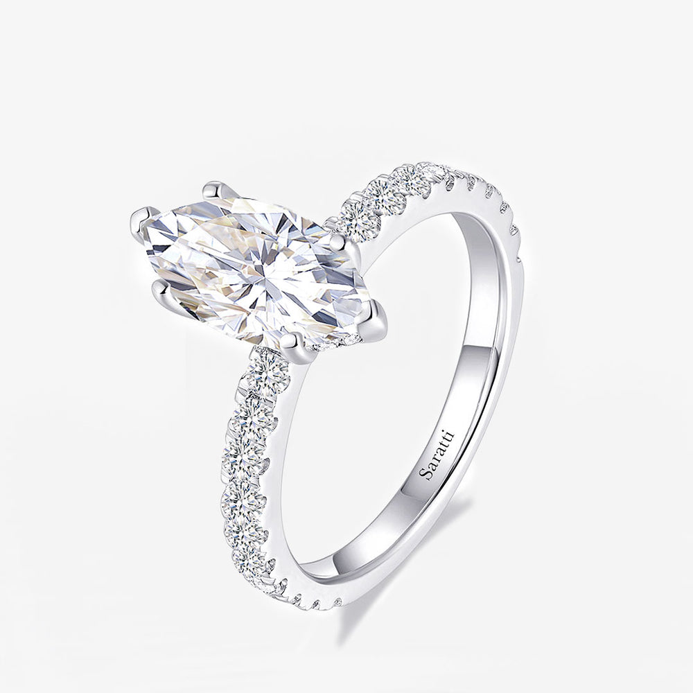 The Cortège Blanc Natural Diamond Ring marries regal elegance with geometric charm. A resplendent marquise-cut diamond takes center stage, its elongated silhouette reminiscent of a noble ship's prow, cutting through waves of light. This majestic centerpiece is escorted by a procession of round brilliant diamonds, their circular perfection creating a dazzling contrast along the band. From casual outings to grand galas, this ring commands attention, its unique blend of forms ensuring you shine in any setting.