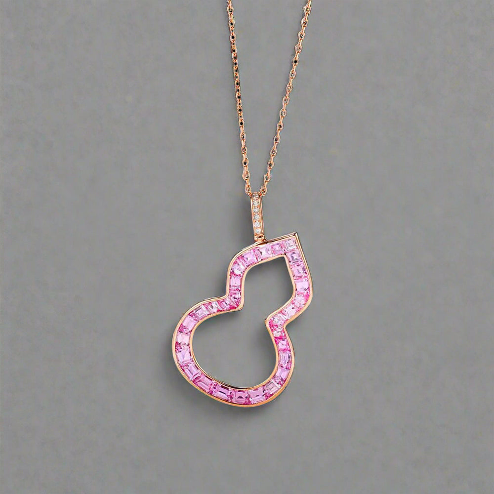 This lovely pendant features a sophisticated gourd or figure-8 silhouette handmade in gleaming 14K rose gold. The open design is adorned with a beautiful array of square-shaped pink sapphires, carefully channel-set along the curved shape, creating a stunning play of light and color.