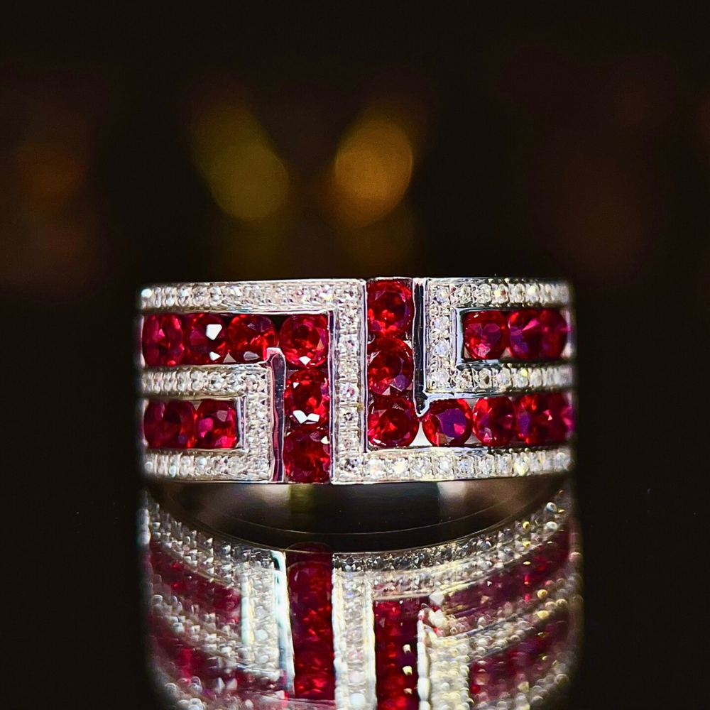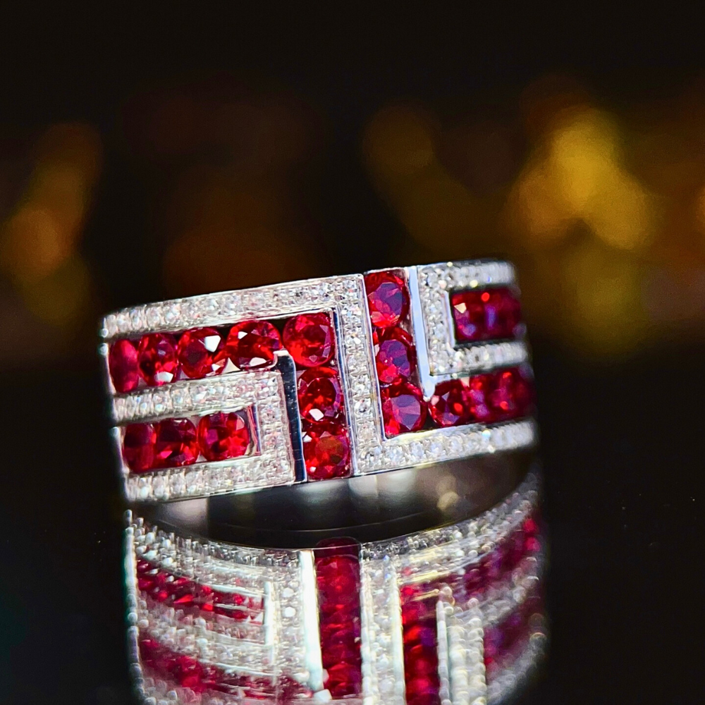 Every empire begins with a vision. Crimson Empire captures that vision in 18K gold, where 1.8 carats of pigeon-blood rubies blaze in bold symmetry. Framed by 72 glittering diamonds, the design unfolds like the geometry of a palace corridor — structured, powerful, unforgettable.