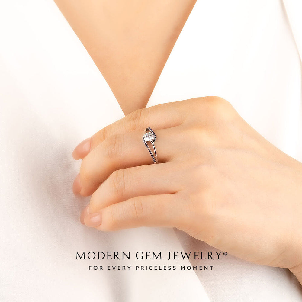 Meet Kelly, a stunning masterpiece of jewelry dreams. She is meant to stop the show. At her heart lies a captivating 1.5 ct. natural diamond. It is also held by four secure prongs. This dazzling center stone is encircled by a gracefully curved split shank. The split shank is adorned with 0.25 carats of vibrant blue natural sapphires which add a flair of heavenly charm.