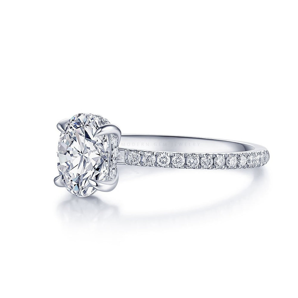 Adriana’s crowning glory is a 1 carat oval diamond. Held by four graceful prongs, this GIA-certified gemstone steals the show with impeccable cut and clarity. The oval shape is particularly significant due to its elongating effect. The design of the setting is noteworthy. Clean lines and a low profile allow the center stone to shine, while elements of design amplify the general aesthetic.