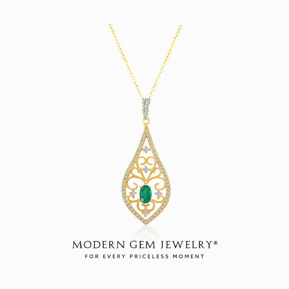 A regal teardrop pendant anchors this stunning necklace, showcasing the harmonious union of emerald and diamonds. At its core, a lush 0.8-carat oval emerald radiates a deep forest green, its velvety surface catching the light with every movement. This gem is embraced by an intricate 18K yellow gold filigree setting, reminiscent of Victorian-era craftsmanship.