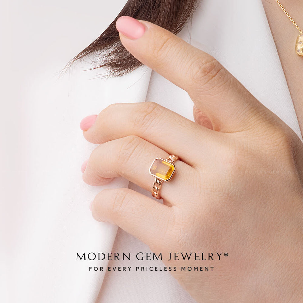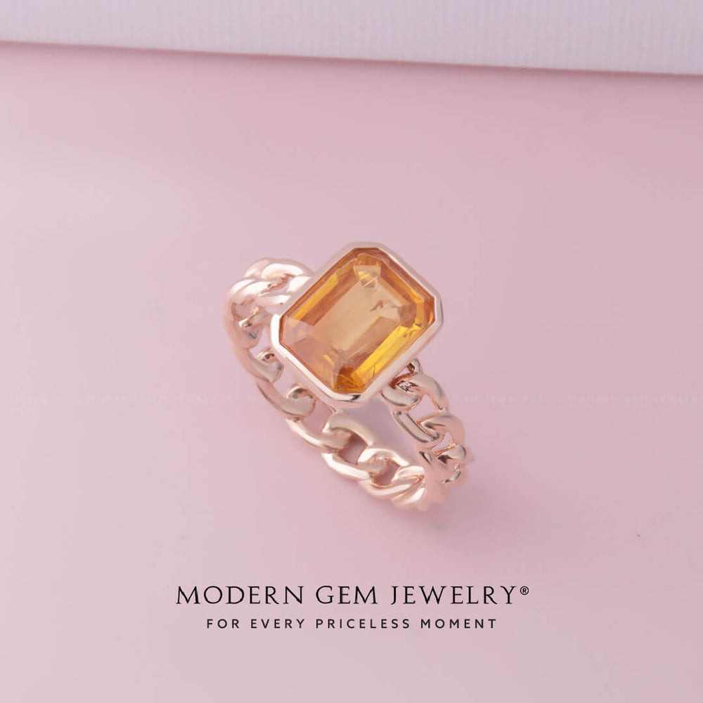 This ring is a total showstopper! It features an emerald-cut sapphire. This is an orange sapphire with a warm, lush glow. It is securely set in a bezel setting which integrates perfectly with the 18K Rose Gold band.