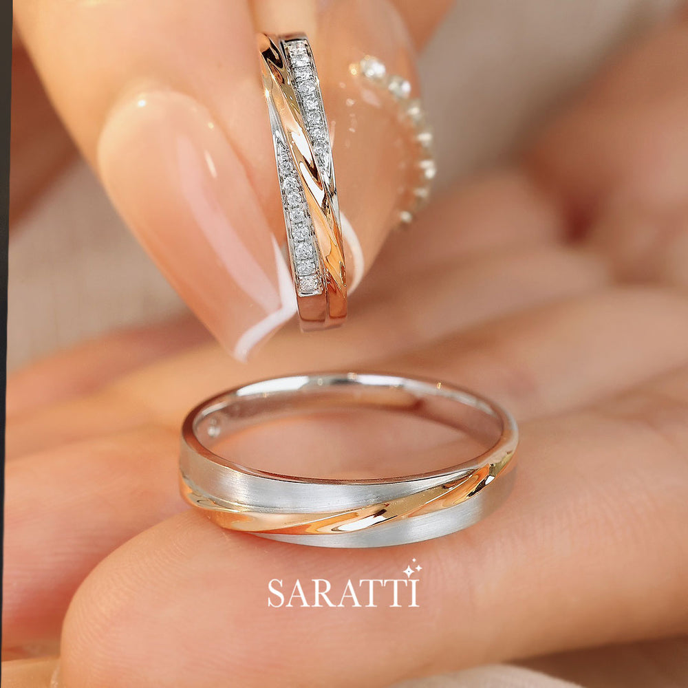 The feminine band shines with a line of dazzling natural diamonds that catch every ray of lights, set precisely within the white gold paths, while its partner has the same captivating twisted design in a sleek, sophisticated style. Each ring complements the other excellently, yet holds its own individuality- much like the perfect match they’re meant to represent. When put together, they create a poem of visuals that speaks of commitment, connection and the amazing adventure of sharing life’s path.