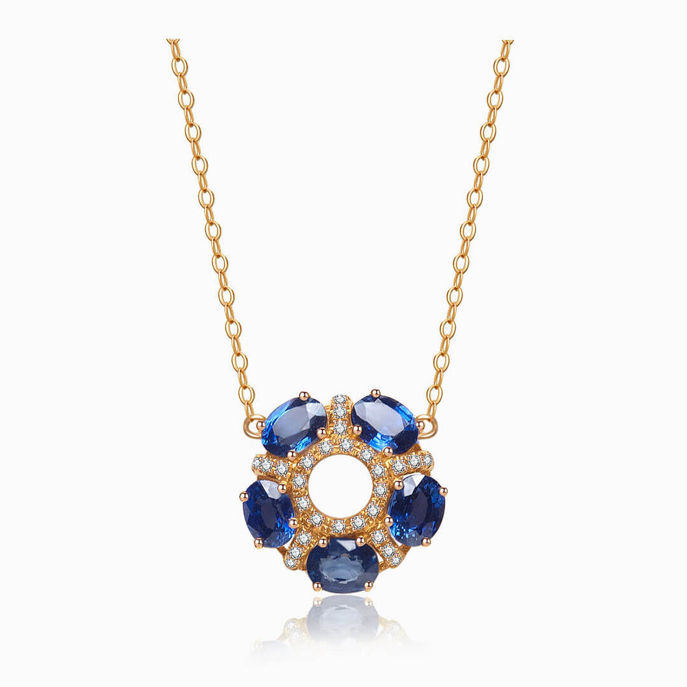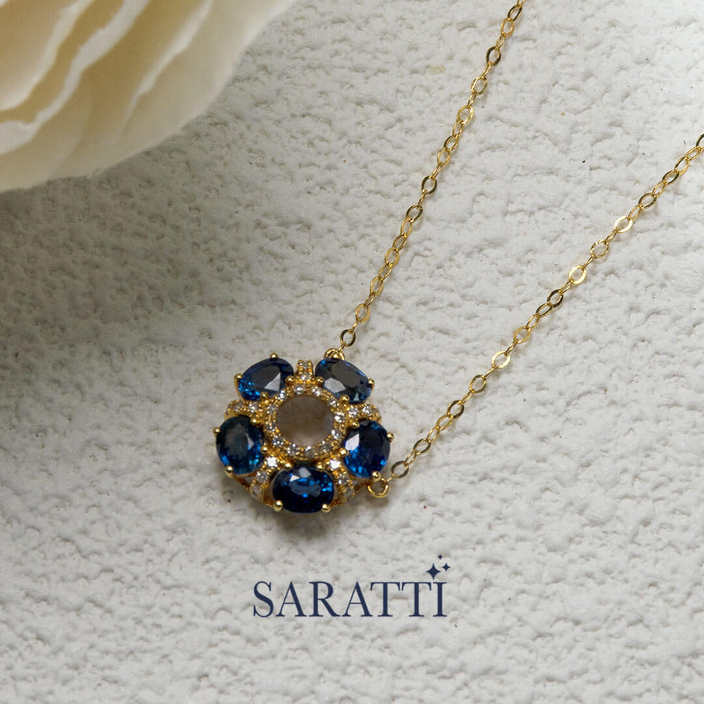 This Saratti creation showcases a floral-inspired centerpiece that captures the aura of a starry night sky. The necklace features five artfully arranged oval cut royal blue natural sapphires. They weigh 1.30 carats in total and are set in a circular pattern around a central open space. Each sapphire is prong-set in 18K yellow gold for ultimate security.