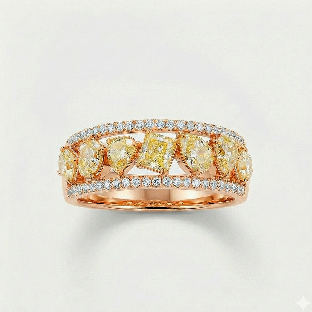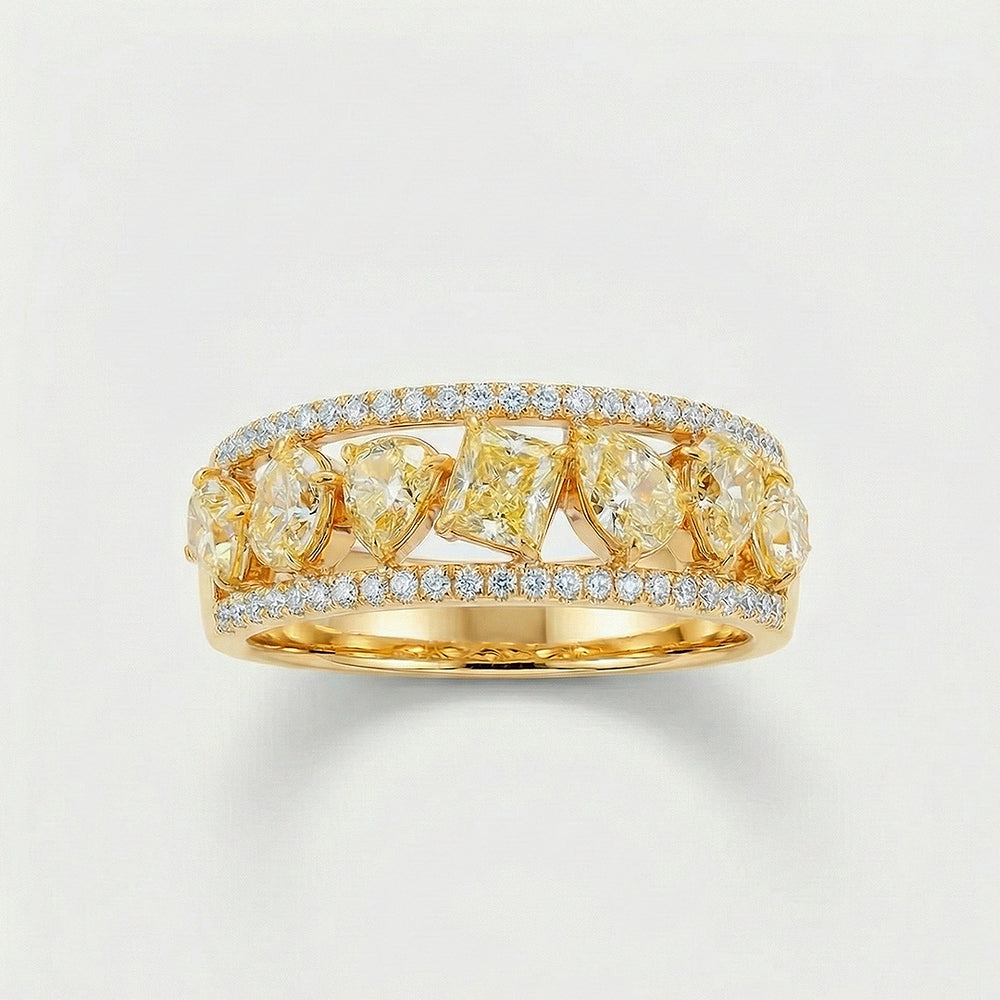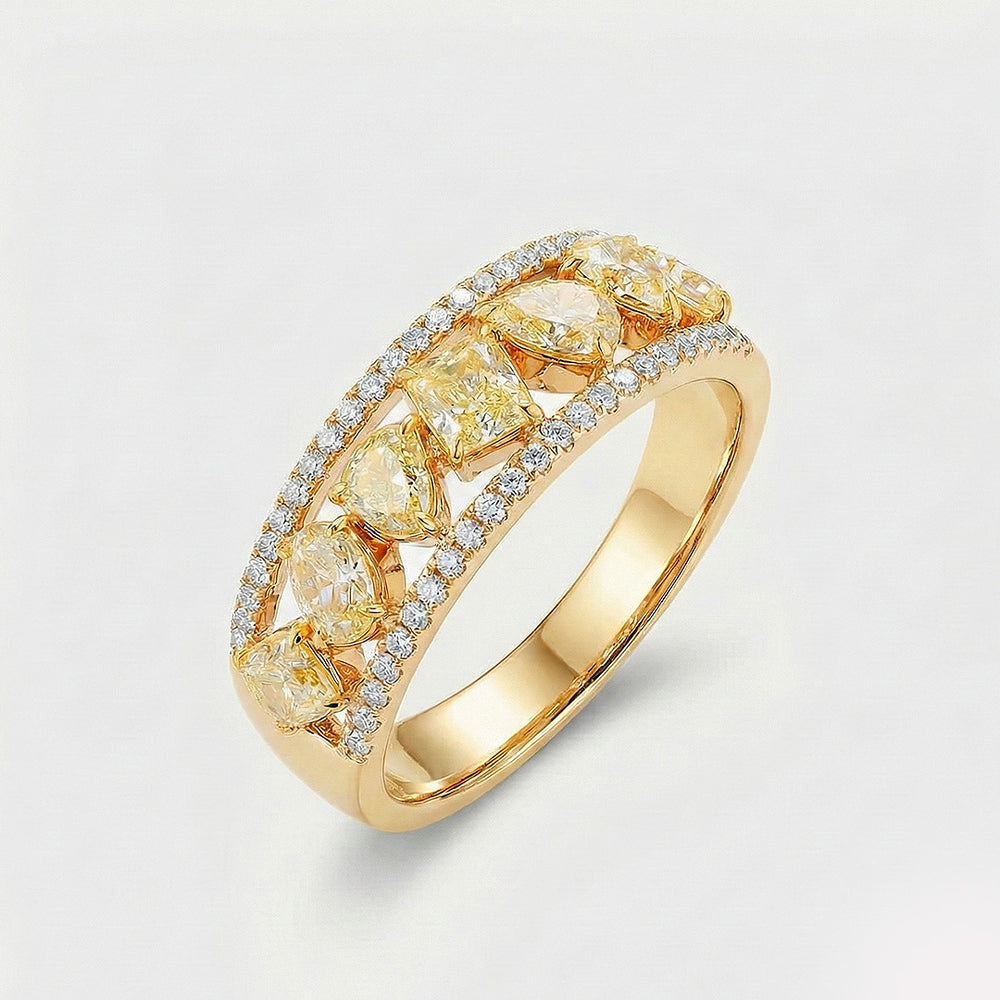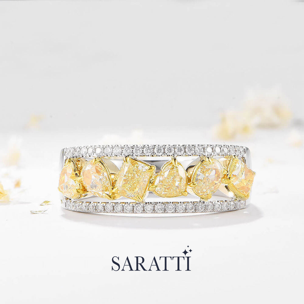 A true symphony in diamonds and gold. This ring captures the essence of a celestial marvel. With the icy fire of colorless diamonds and the sunny gleam of fancy yellow diamonds, it is like flowing stardust through a river of white gold. A captivating collection of uniquely cut yellow diamonds-pear, heart, radiant and oval which weigh a total of 1.14 carats, create a dance of color and light.