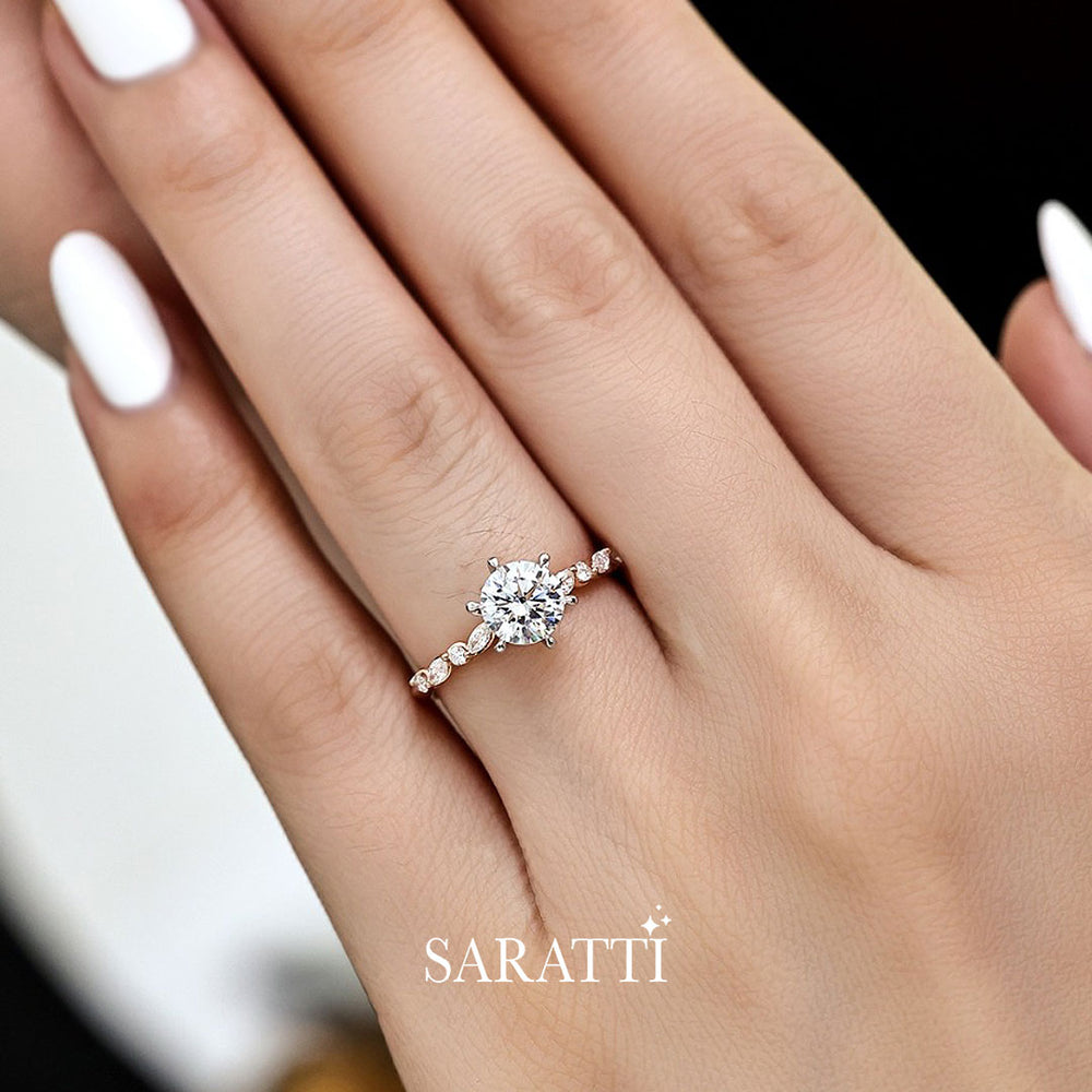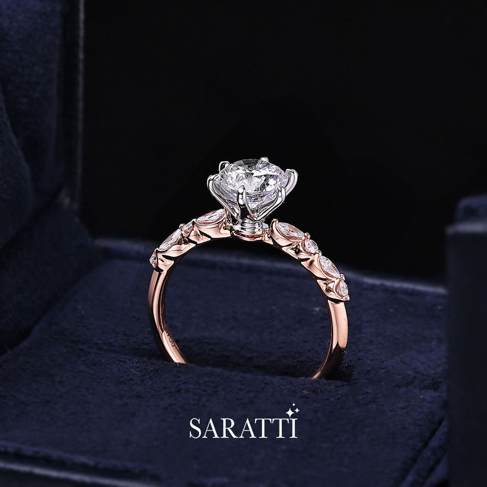 Meet Faye, a ring that dances on the intersection between reality and fantasy. This enchanting piece is not just jewelry; it is a celebration of the cherished moments in life, captured in diamonds and rose gold. At her core is a round-brilliant diamond, held atop by a crown of six artfully crafted prongs.