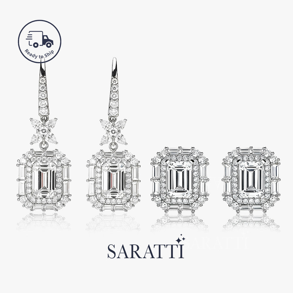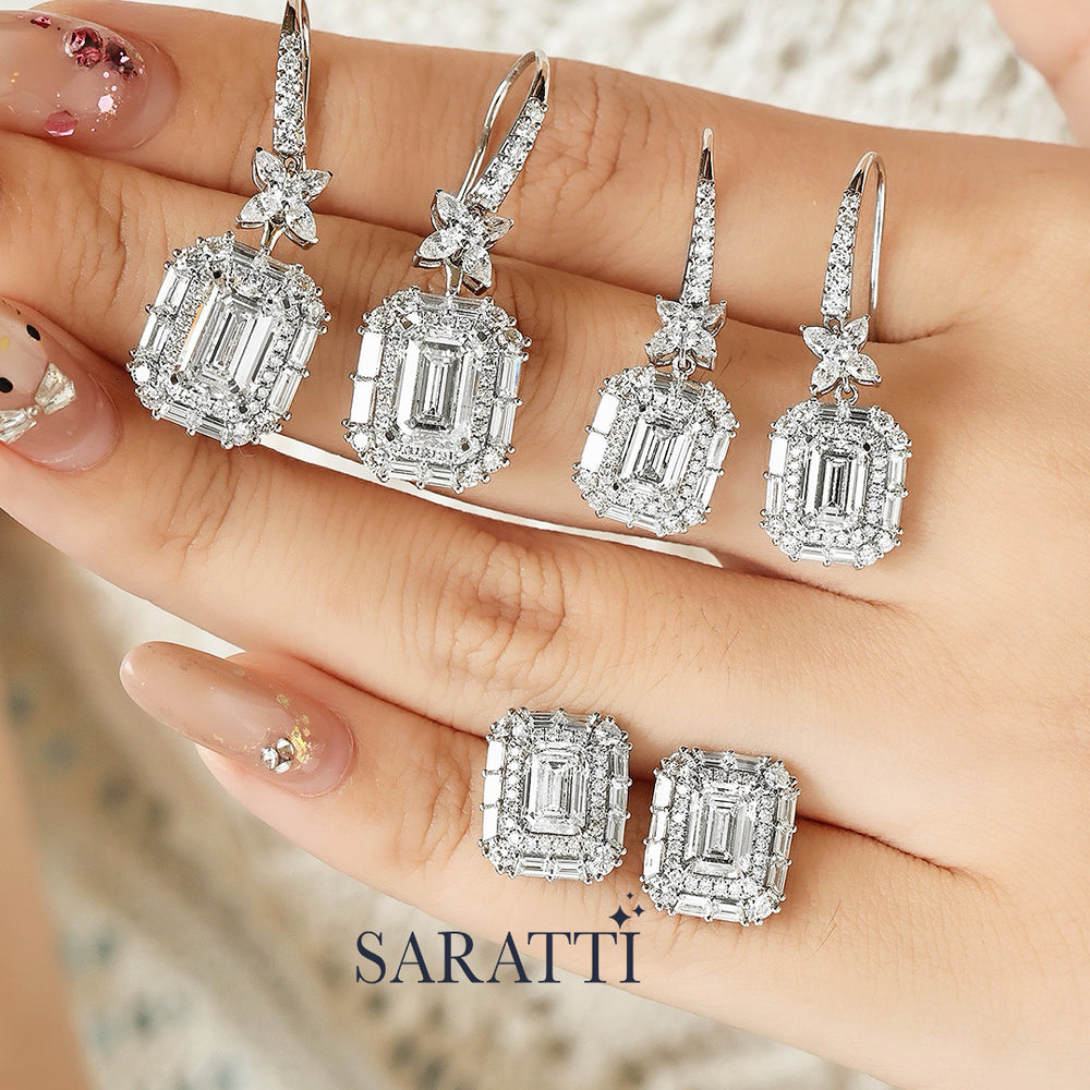 The emerald-cut center reflects clean, architectural fire, while the surrounding halo softens the silhouette with delicate brilliance, much like frost sparkling on a cold morning window. Available in two versions — a classic stud and an elegant hoop — each pair offers a composed, polished presence.