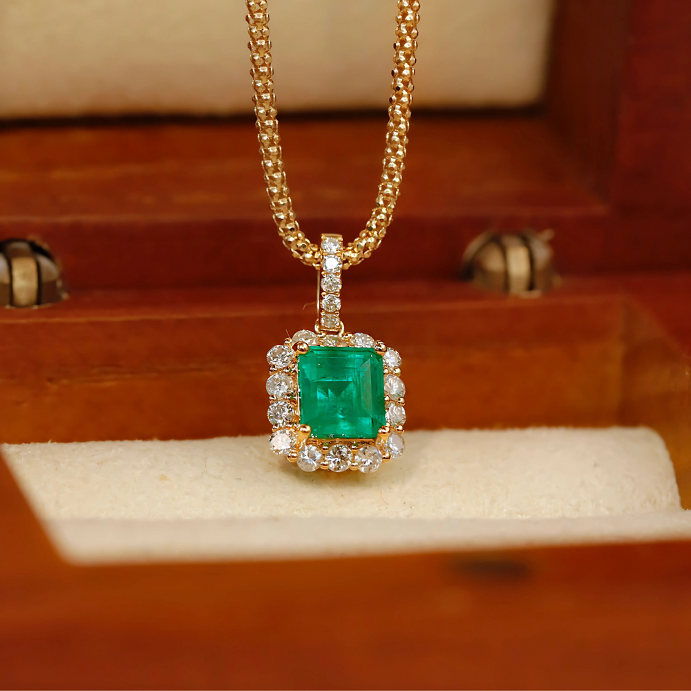 This Imperial Oasis pendant showcases a rare 0.75-carat Afghan natural emerald gem that stuns with its deep verdant hue and excellent clarity rarely found in emeralds of this caliber. The emerald’s square cut increases its rich color depth while the surrounding halo of 0.22 carats of natural diamonds creates a dazzling frame that enhances the center stone’s lush green tones with their icy white sparkle.