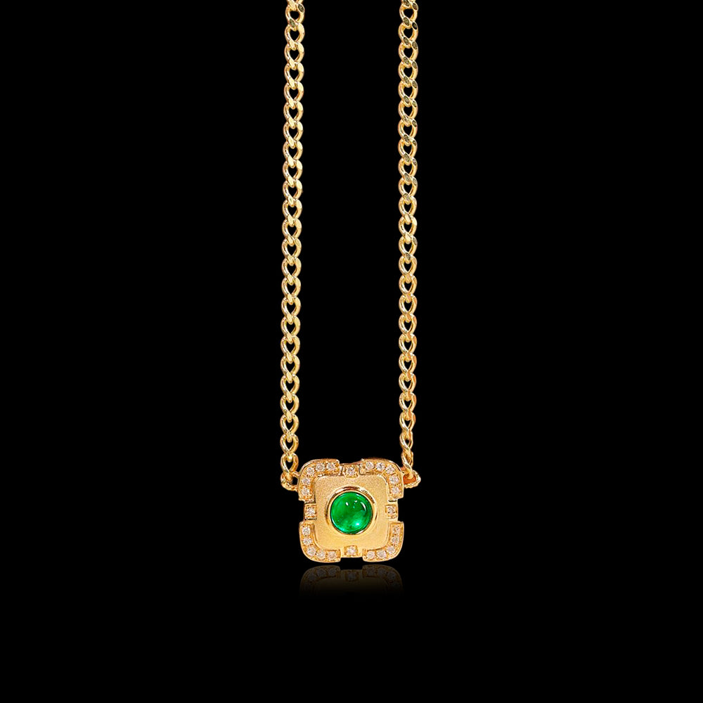 Handcrafted in shiny 18K yellow gold, this pendant turns a simple chain into a statement of unspoken power, with a delicate diamond halo that makes the emerald’s deep green burst with unparalleled brilliance.