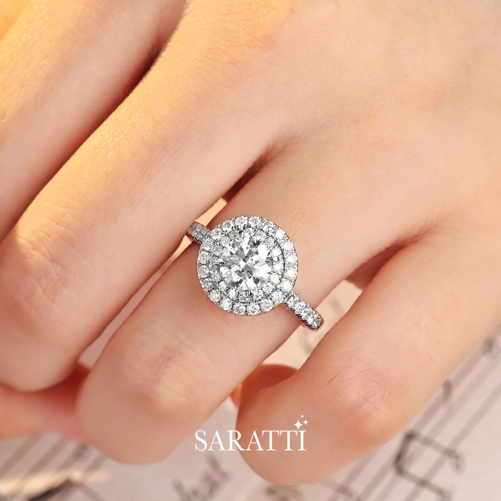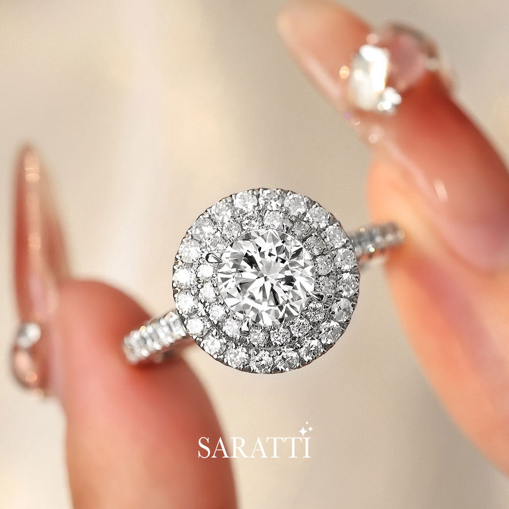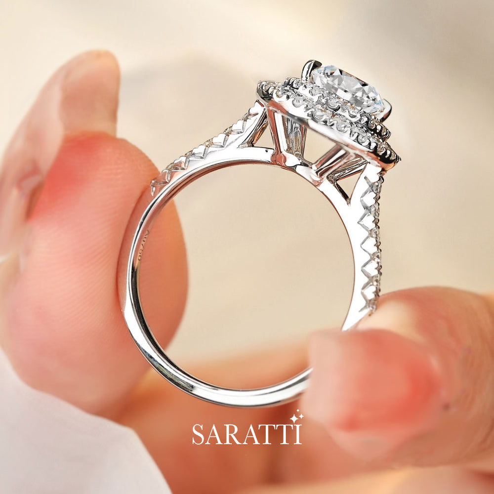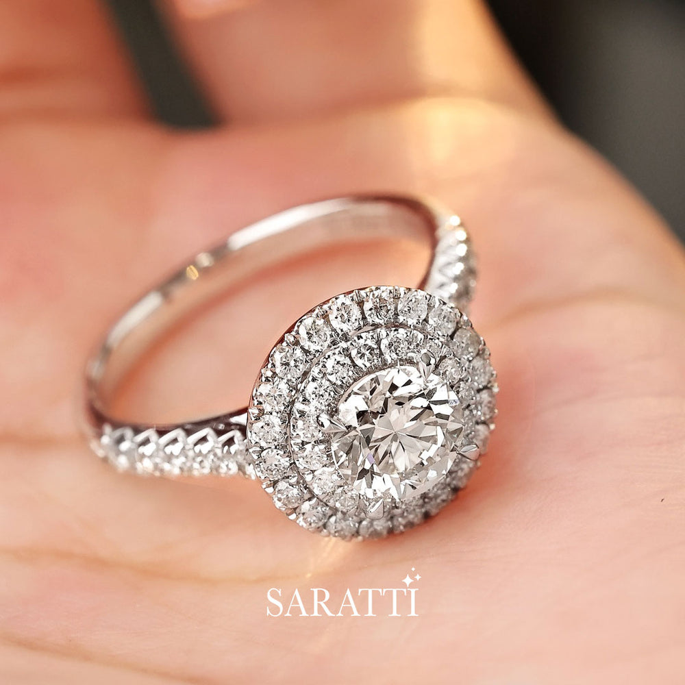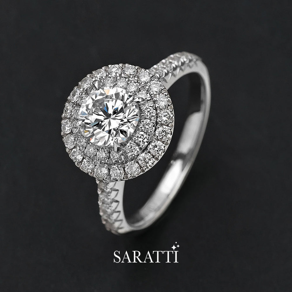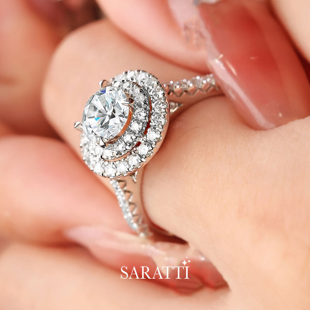 Love sparkles twice in diamond's embrace. White gold weaves tales of doubled devotion. The Gleaming Promise Diamond Ring is a dazzling token of your bond. This bright creation shapes white gold into a story of dual affection. With its split shank and double halo design, your love story unfolds in layers of light.