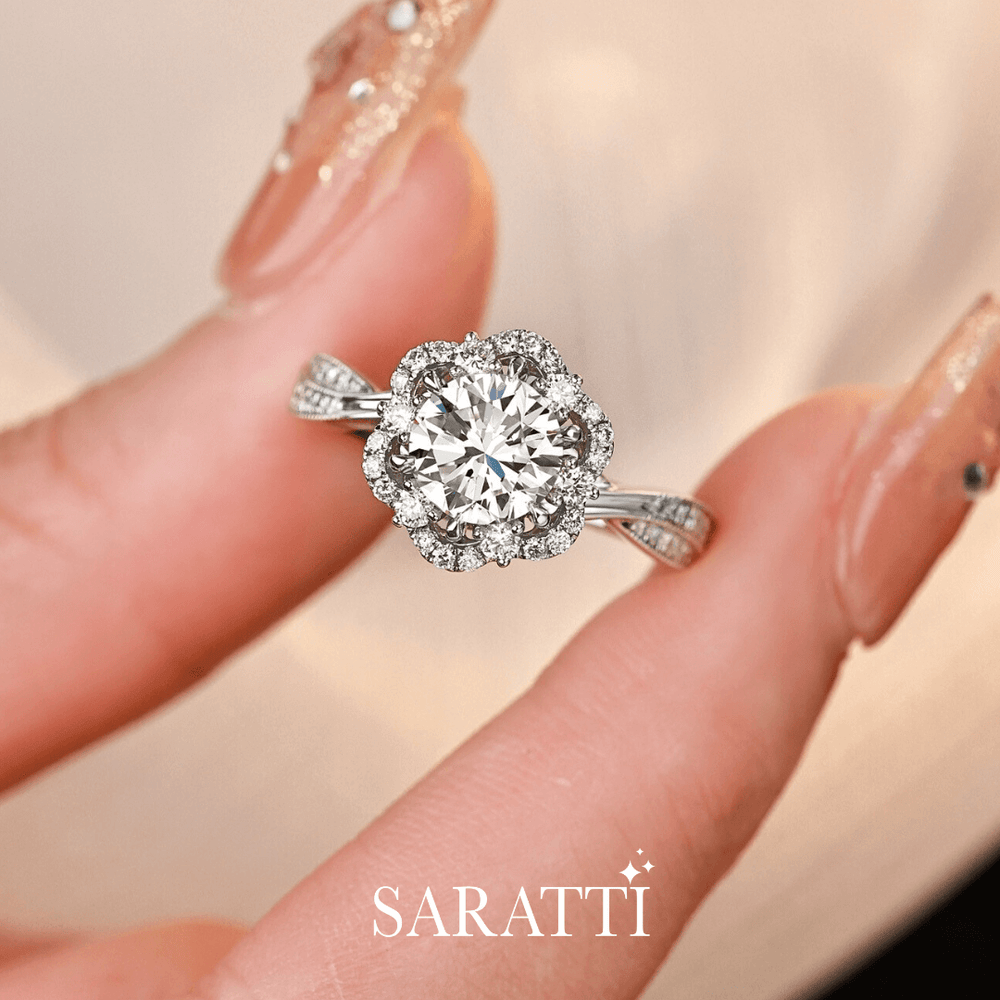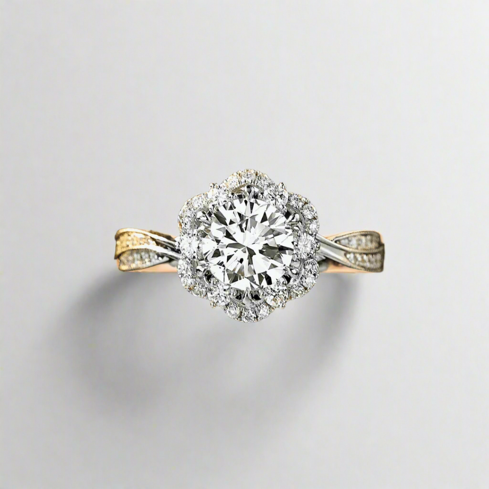 A refined and radiant expression of eternal love, this ring features a round center stone framed by a double interlocking diamond halo in polished 18K white gold. Its split shank, pavé-set diamonds, and intricate setting create a design that feels both graceful and regal, embodying timeless beauty.